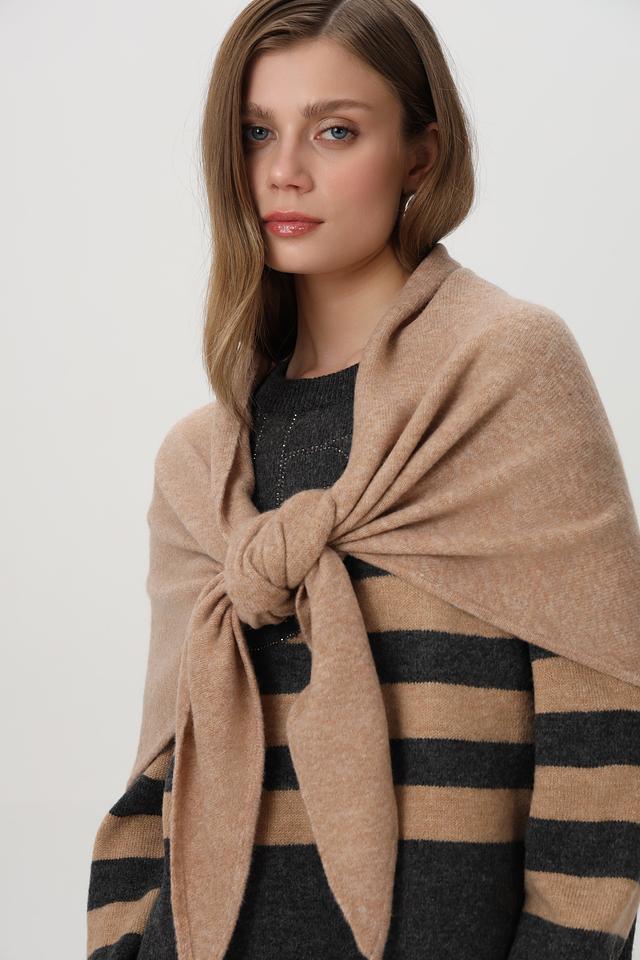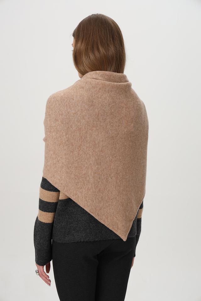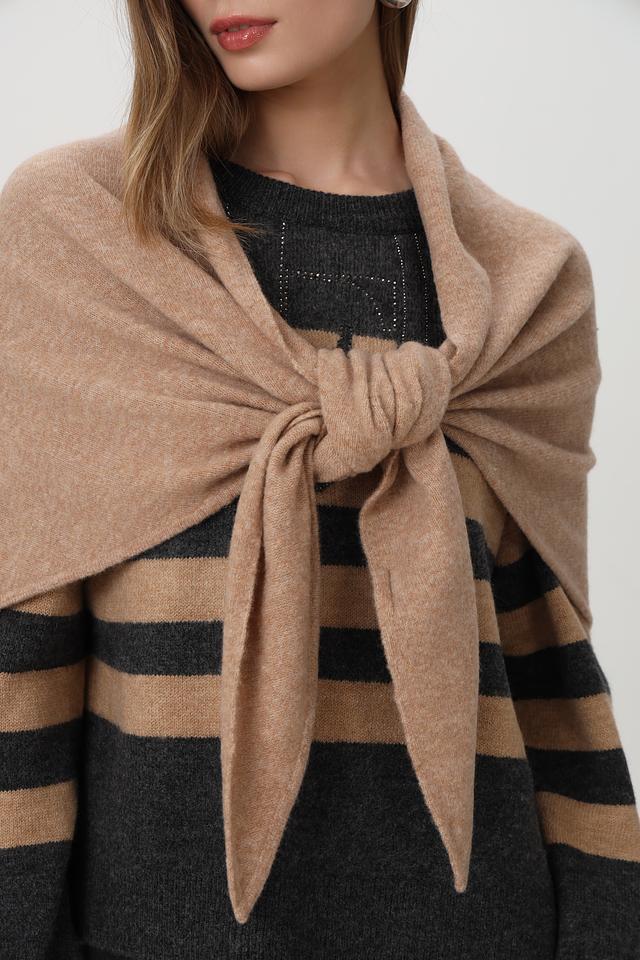 Модель выполнена в форме трапеции, что позволяет носить её различными способами: как шарф, накидку или палантин.