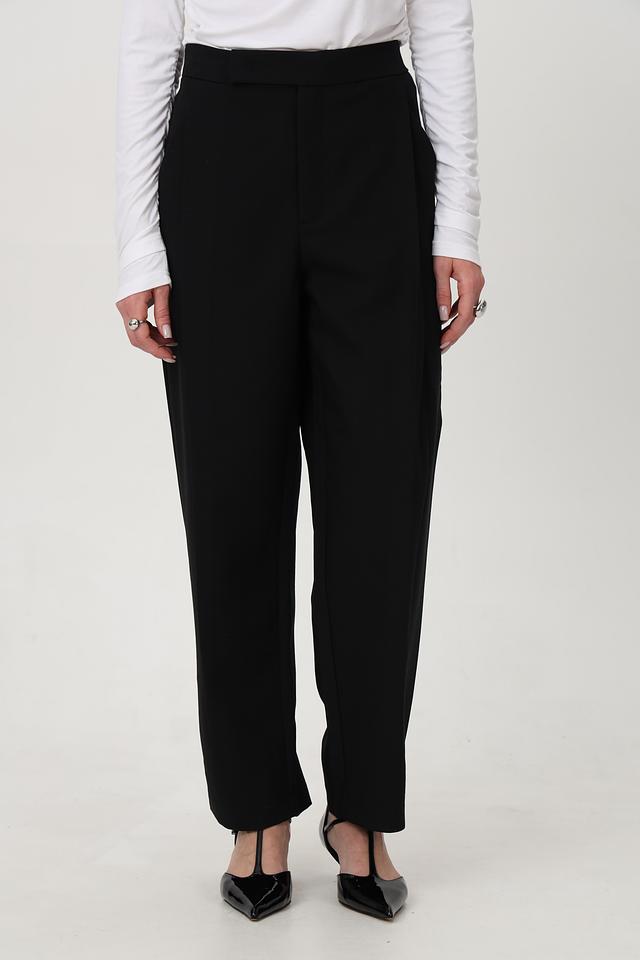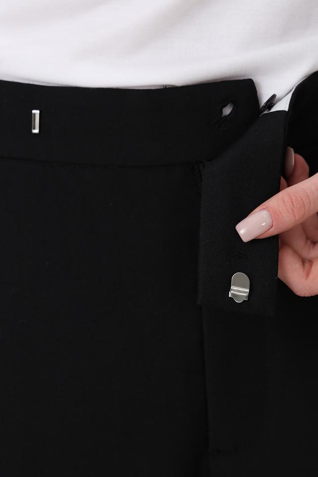Брюки имеют прямой крой и высокую посадку, обеспечивая комфортную посадку по фигуре. Пояс дополнен застежкой-молнией и крючком, что обеспечивает надежную фиксацию. Наличие боковых карманов добавляет практичности.