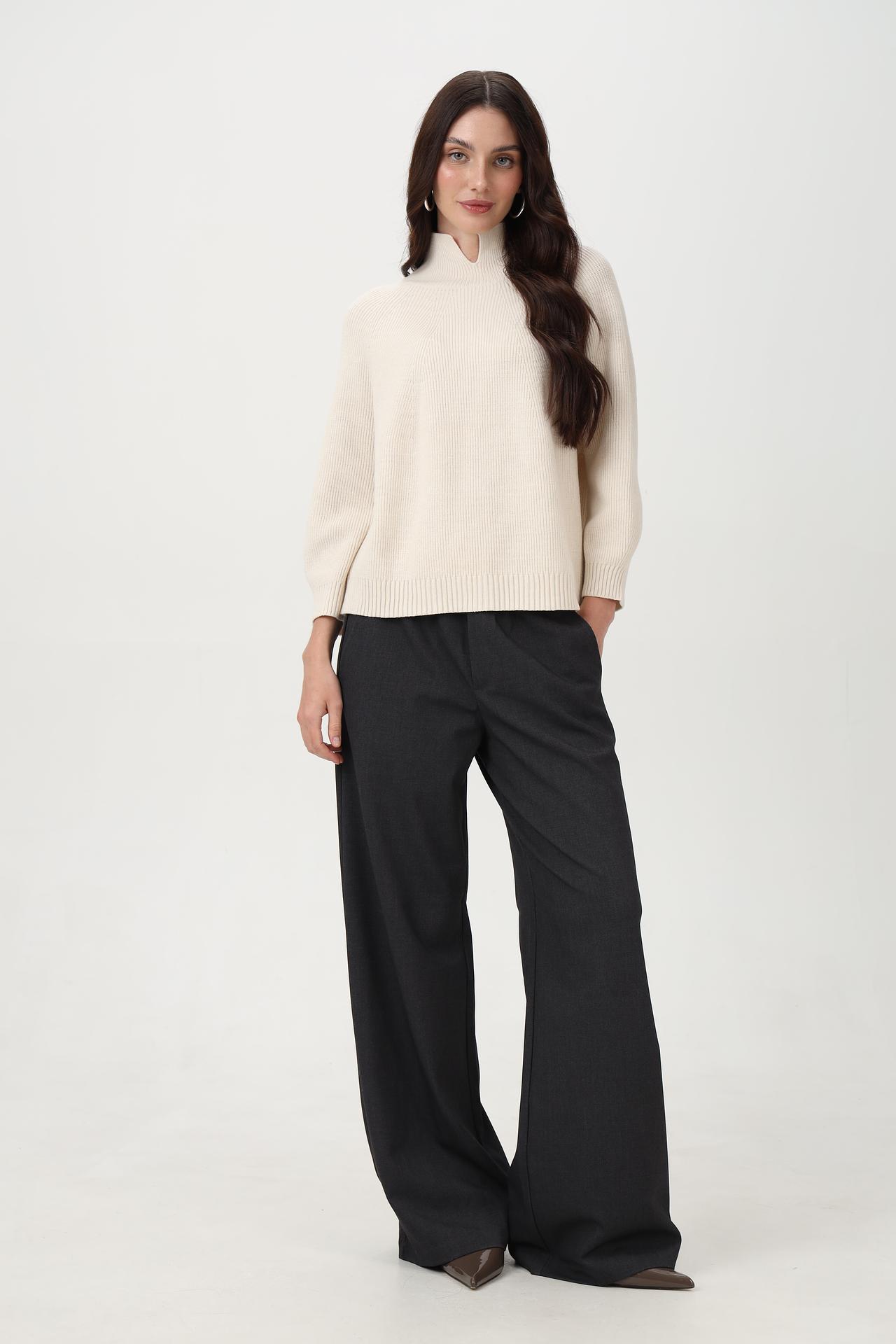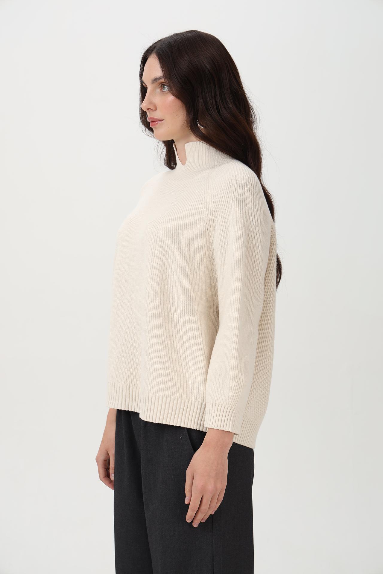 - Дизайн: Классический крой с элегантным воротником-стойкой и небольшим вырезом придает модели утонченность. Ребристая вязка по всей поверхности добавляет изделию фактурности и визуальной привлекательности.