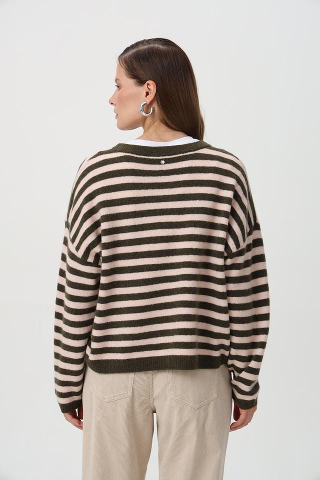 Женский пуловер Oui зеленого и бежевого цвета в классическую полоску. Изготовлен из мягкой шерсти с добавлением полиамида и других синтетических волокон для комфорта и долговечности. Состав: полиамид 44%, шерсть 32%, полиэстер 21%, эластан 3%
