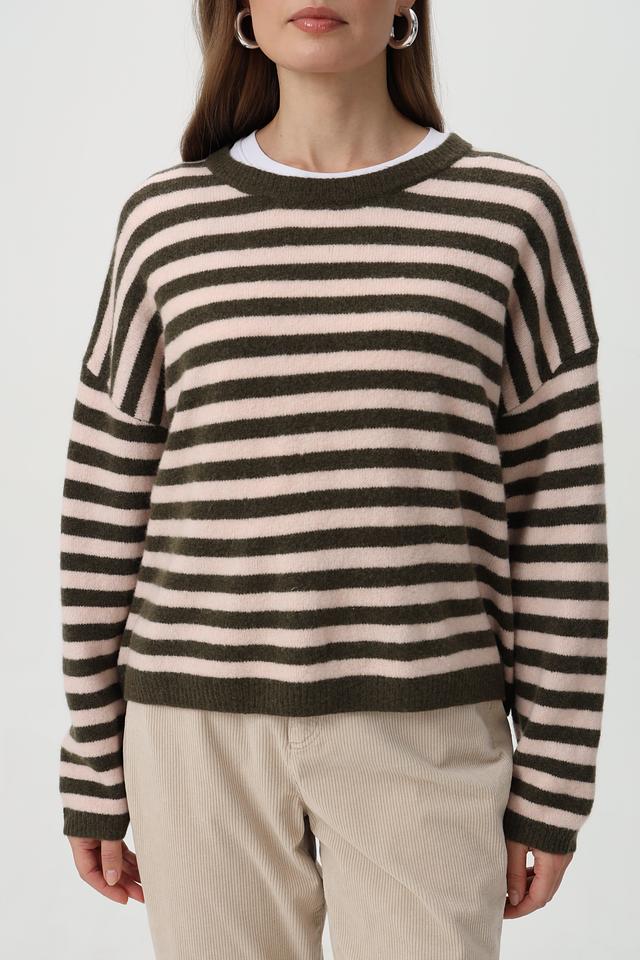 Женский пуловер от бренда Oui выполнен в актуальной полосатой расцветке, сочетающей оттенки зеленого и бежевого. Модель имеет круглый вырез горловины и длинные рукава.