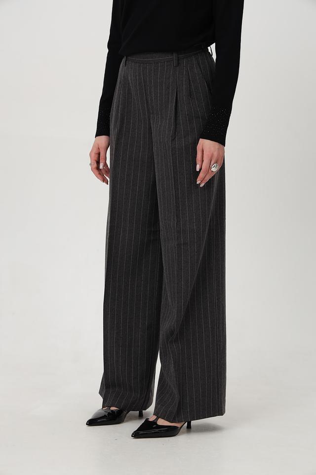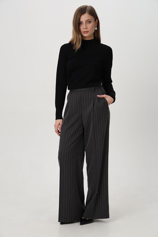 Брюки имеют свободный крой и высокую посадку, что обеспечивает комфортную посадку по фигуре. Наличие боковых карманов и защипов добавляет функциональности и изысканности.
