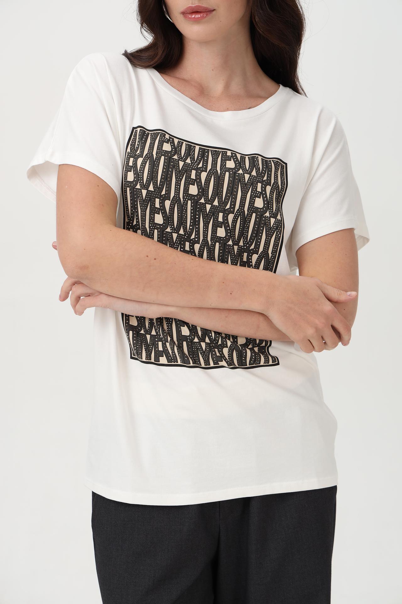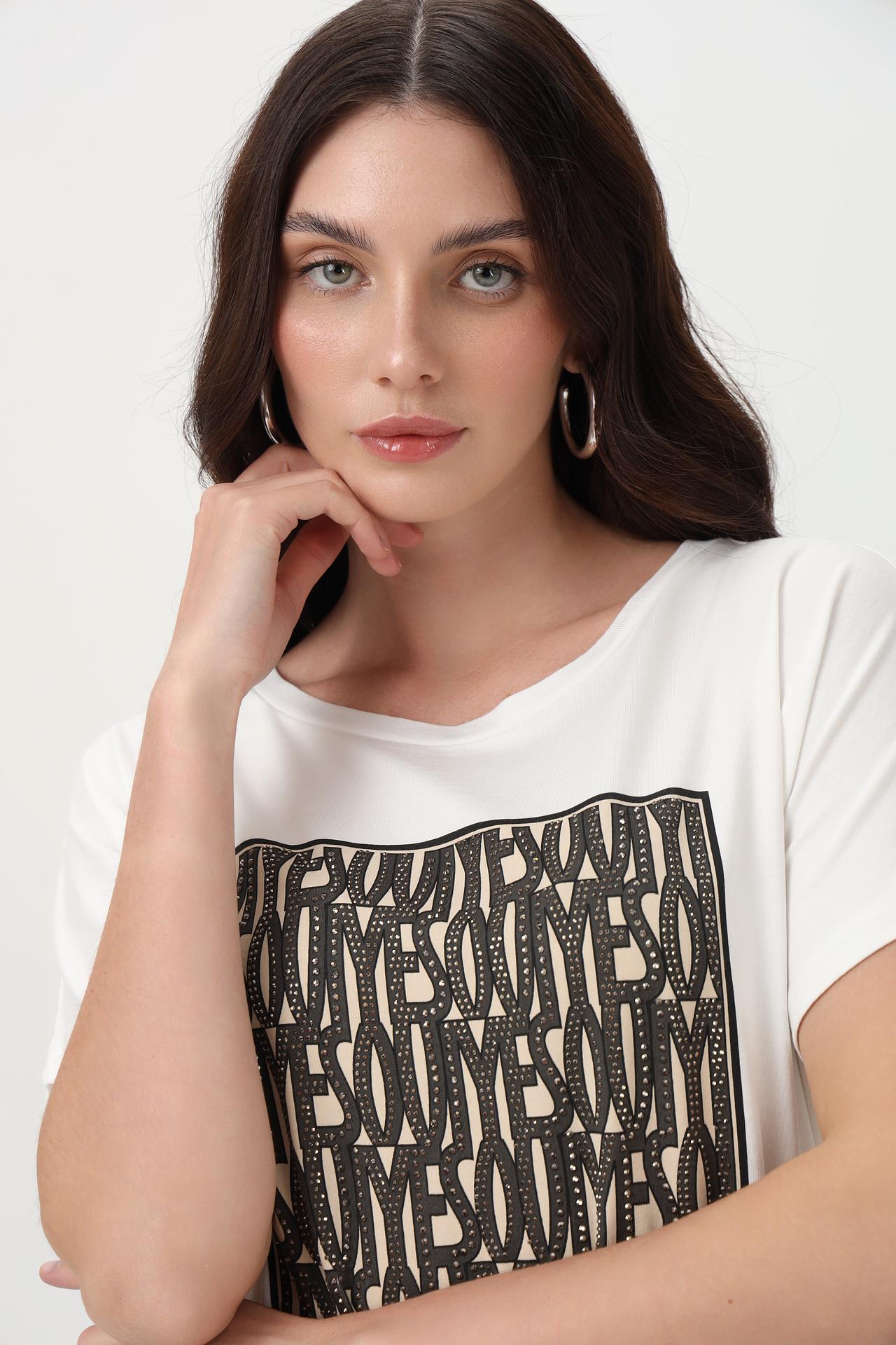 - Дизайн и принт: Классический прямой крой и округлый вырез горловины создают элегантный силуэт. Крупный графический принт в черной рамке с повторяющимся узором из букв выглядит современно и стильно. Этот элемент делает футболку Oui акцентной деталью образа.