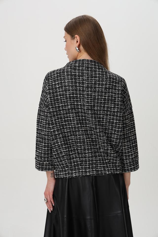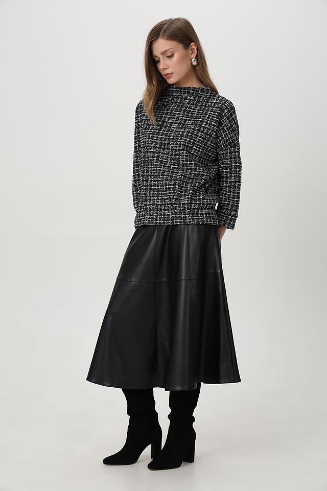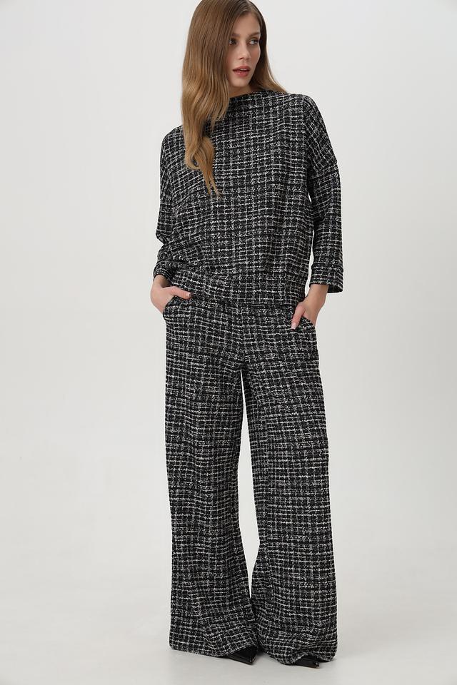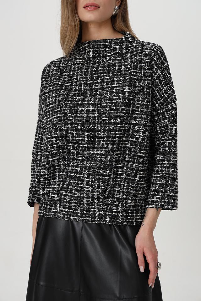 Изысканный пуловер от бренда Oui выполнен в классической чёрно-белой клетке, придающей ему элегантный и универсальный вид.