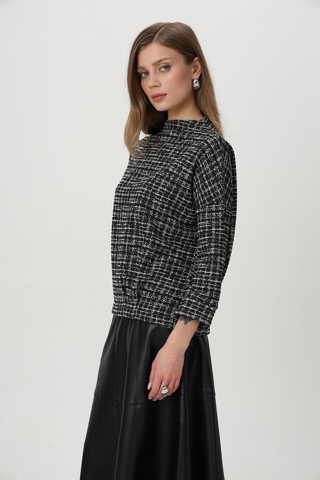 Модель имеет свободный крой, который обеспечивает комфортную посадку по фигуре. Воротник-стойка добавляет изысканности, а короткие рукава делают пуловер подходящим для тёплой погоды или ношения под жакет.
