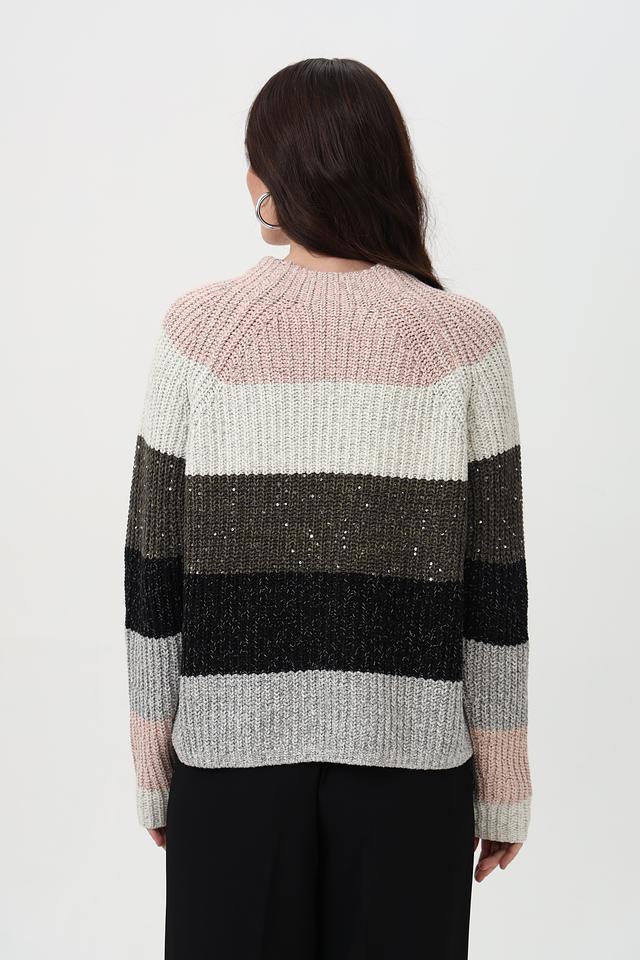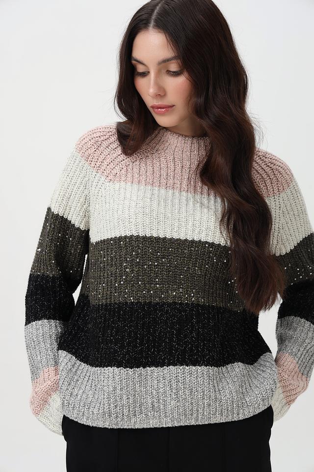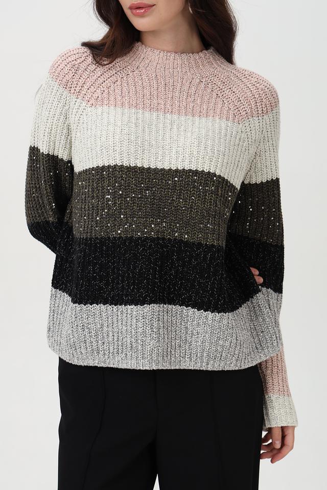 Пуловер имеет круглый вырез и длинные рукава, обеспечивающие комфортную посадку. На полосах деликатно вплетены пайетки, придающие изделию лёгкое мерцание и праздничный вид. Свободный крой не сковывает движений и позволяет создать расслабленный образ.