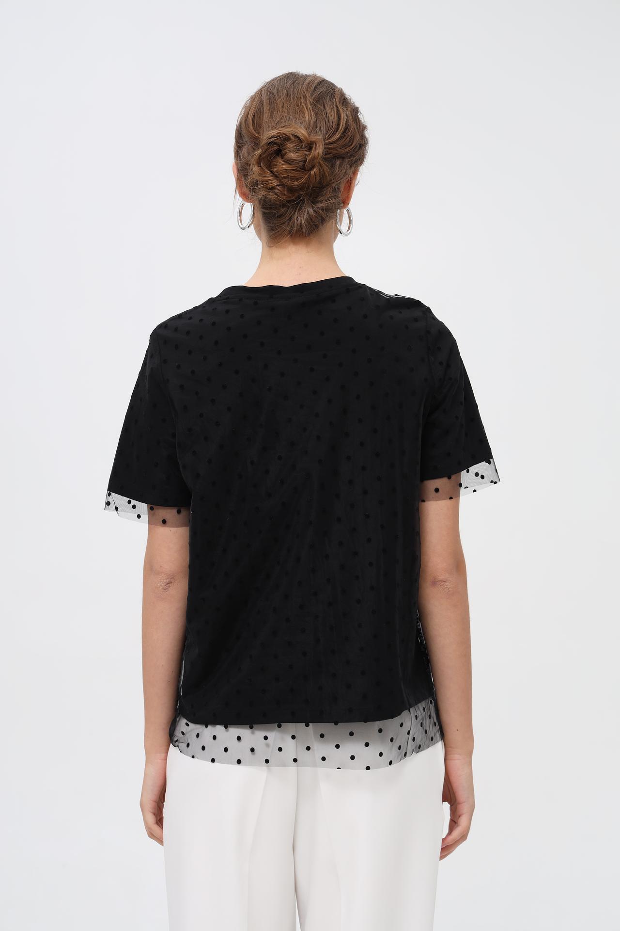 - Дизайн: Футболка имеет оригинальный многослойный крой с прозрачными вставками из сетки в горошек на рукавах и по подолу. На груди расположен рельефный принт Oui, декорированный мерцающими элементами.