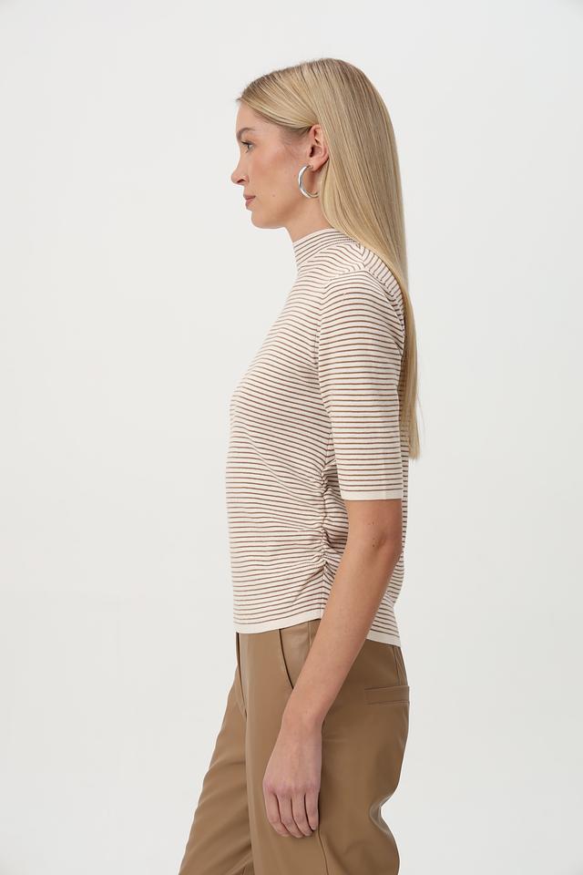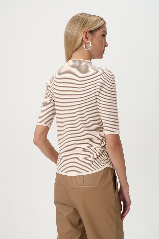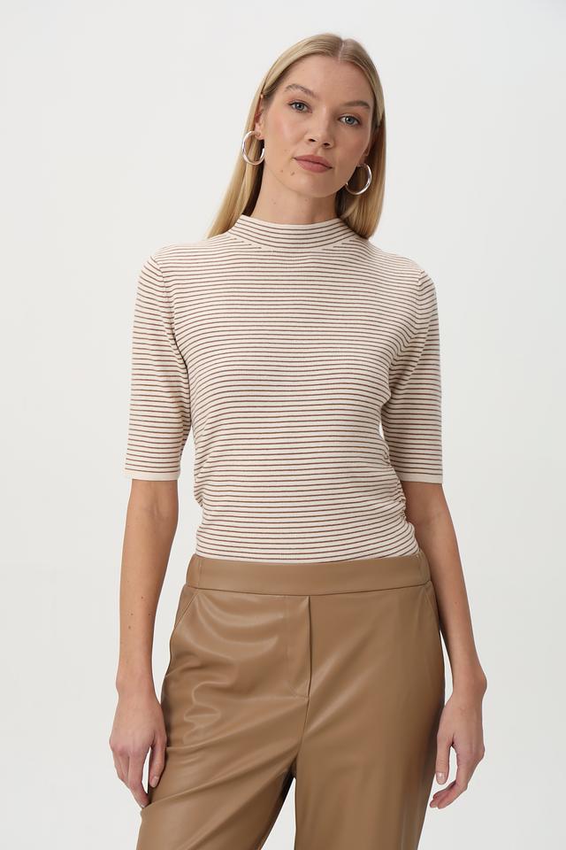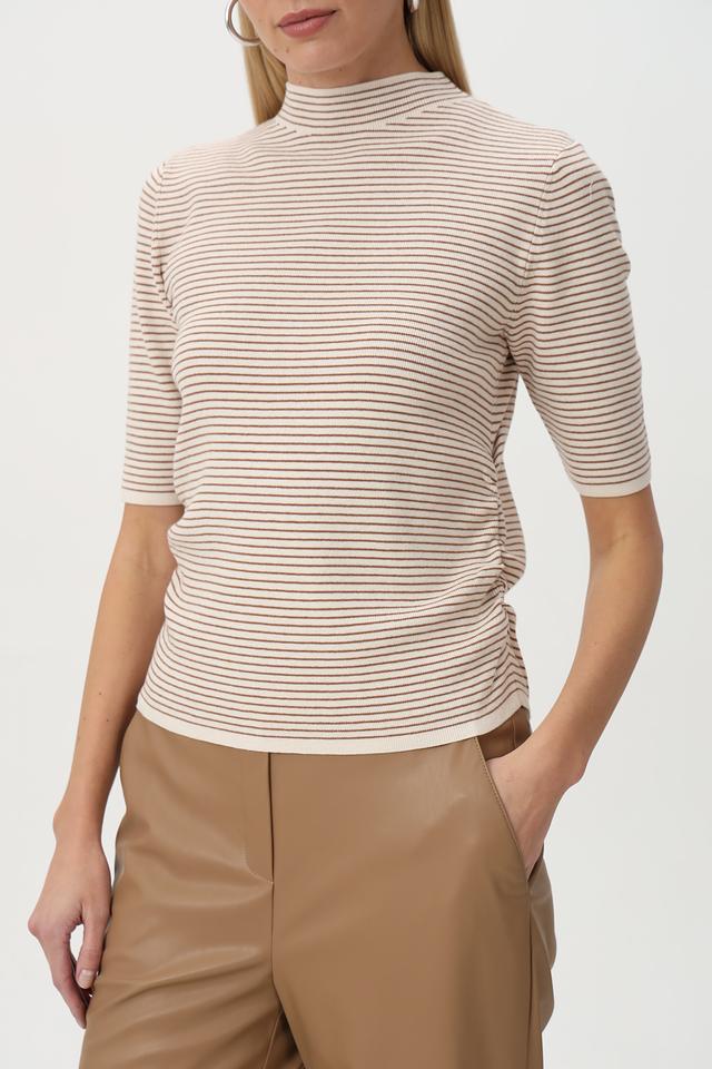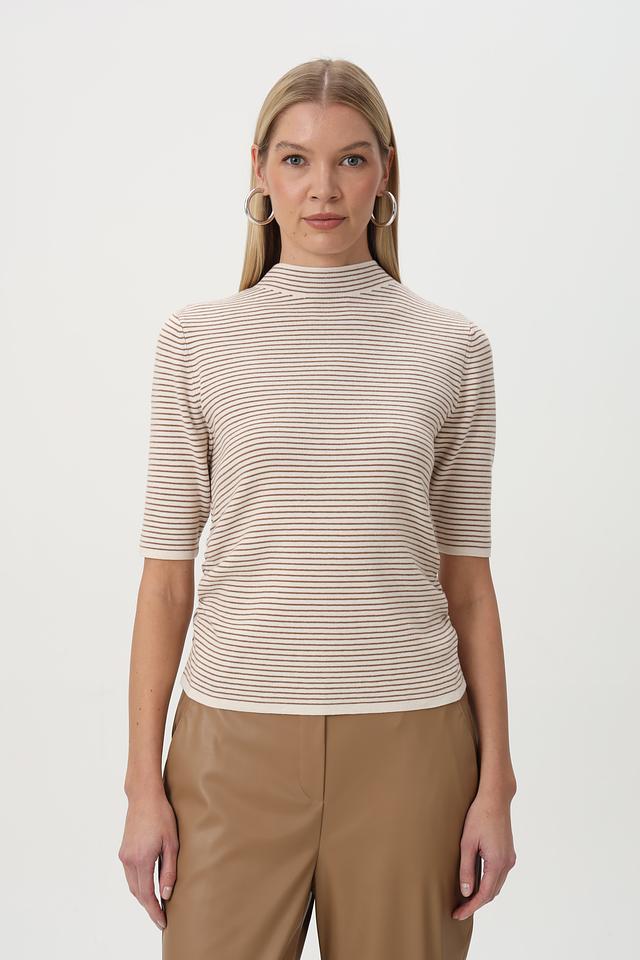 Пуловер имеет облегающий силуэт, короткие рукава и воротник-стойку. Горизонтальная полоска бежевого, коричневого и белого цветов придает изделию свежий и современный вид.