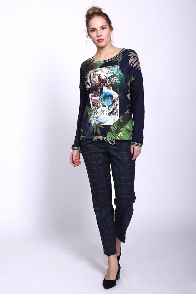 Блуза женская синего цвета от немецкого бренда Oui. Модель выполнена прямым фасоном. Изделие дополнено округлым воротом, приспущенными, длинными рукавами. Окружность ворота и рукава обшиты тесьмой. Низ блузы фиксируется тесьмой. Передняя часть блузы имеет разноцветный принт. Ткань состоит из 100% вискозы. Сочетать можно с различными брюками.