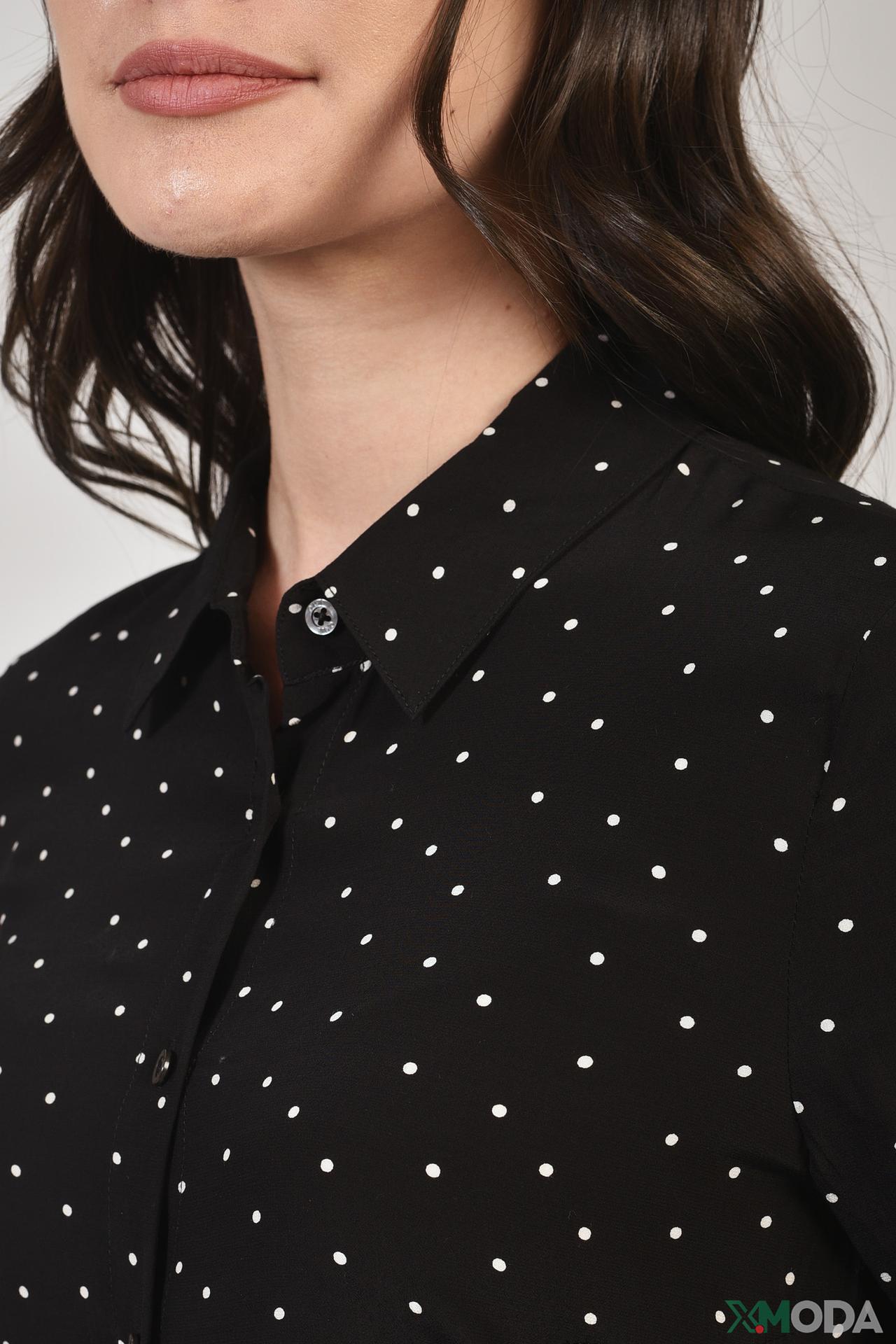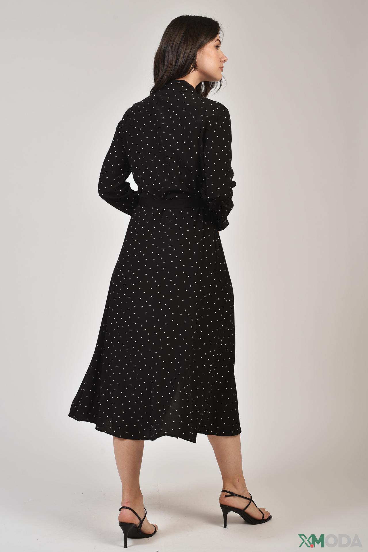 - Дизайн: Классический черный фон в мелкий белый горошек. Такой принт всегда актуален и добавляет образу женственности и игривости.