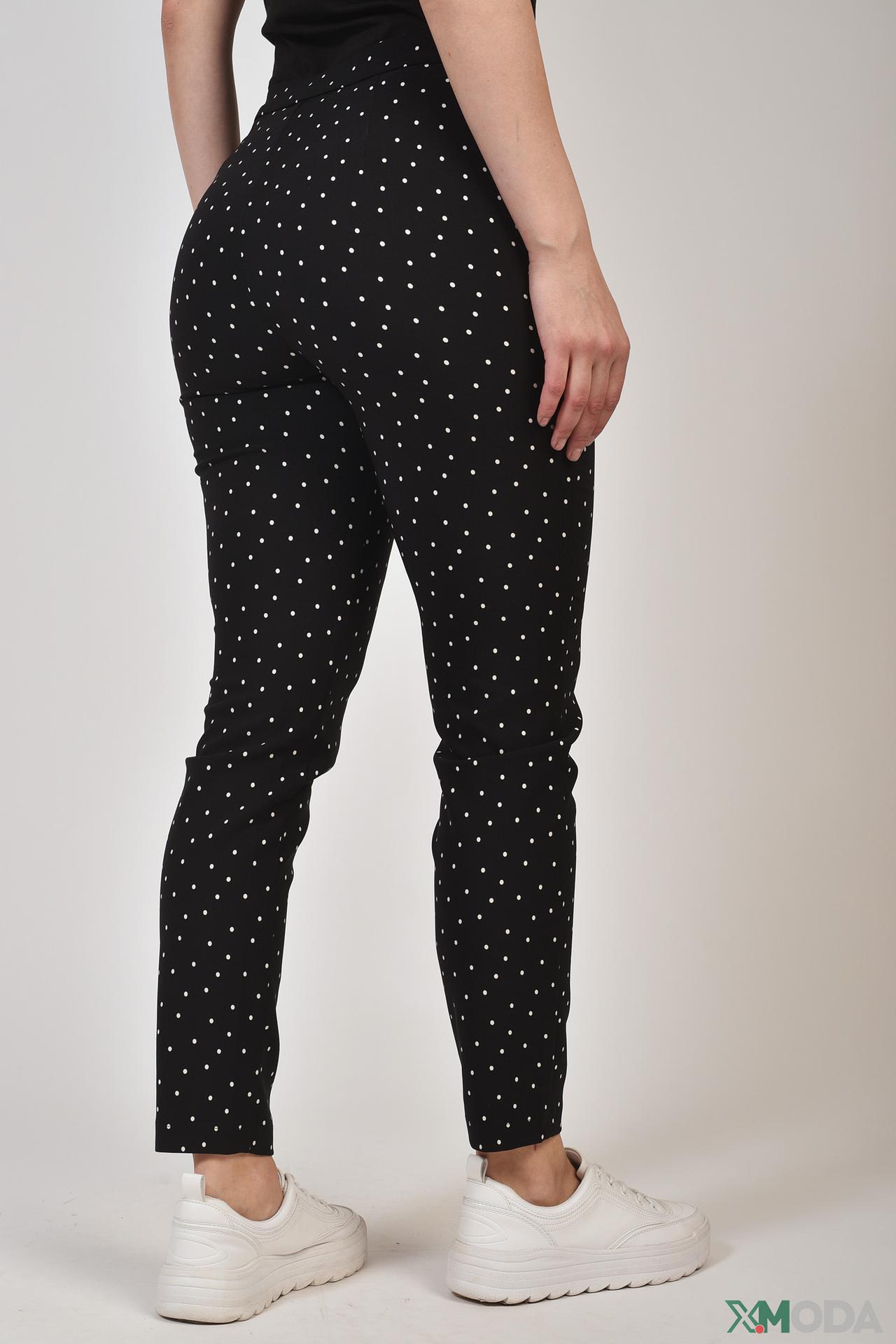 - Дизайн: Классический прямой крой с принтом в мелкий белый горошек на черном фоне. Высокая посадка подчеркивает фигуру.