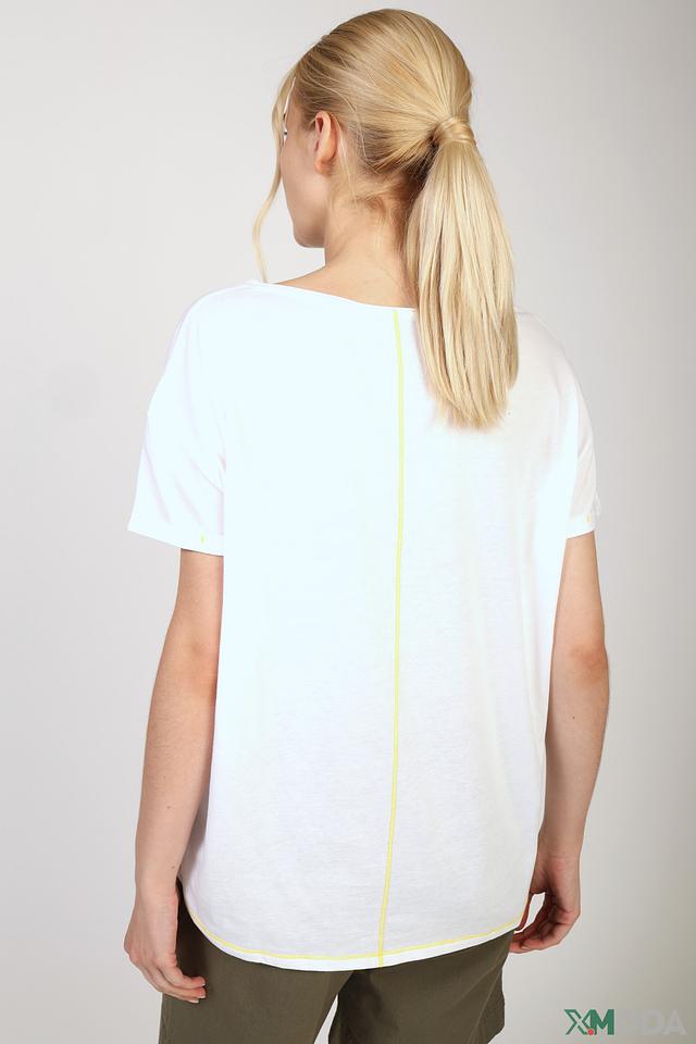 Дополнительным акцентом служат тонкие жёлтые полоски по краю горловины и низу изделия. Эта футболка идеально подходит для создания летних образов и сочетается с различными элементами одежды, такими как джинсы, шорты или юбки.