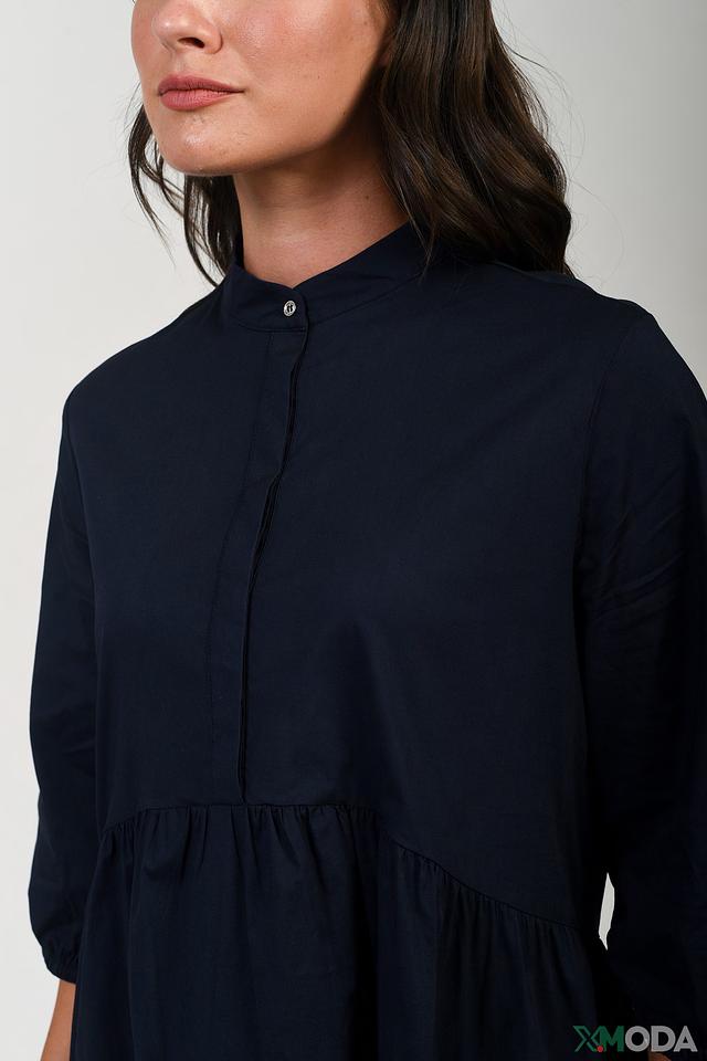 Модель имеет рубашечный крой с воротником-стойкой и застёжкой на пуговицы. Рукава длиной три четверти со сборками по плечу придают платью лёгкость и воздушность.