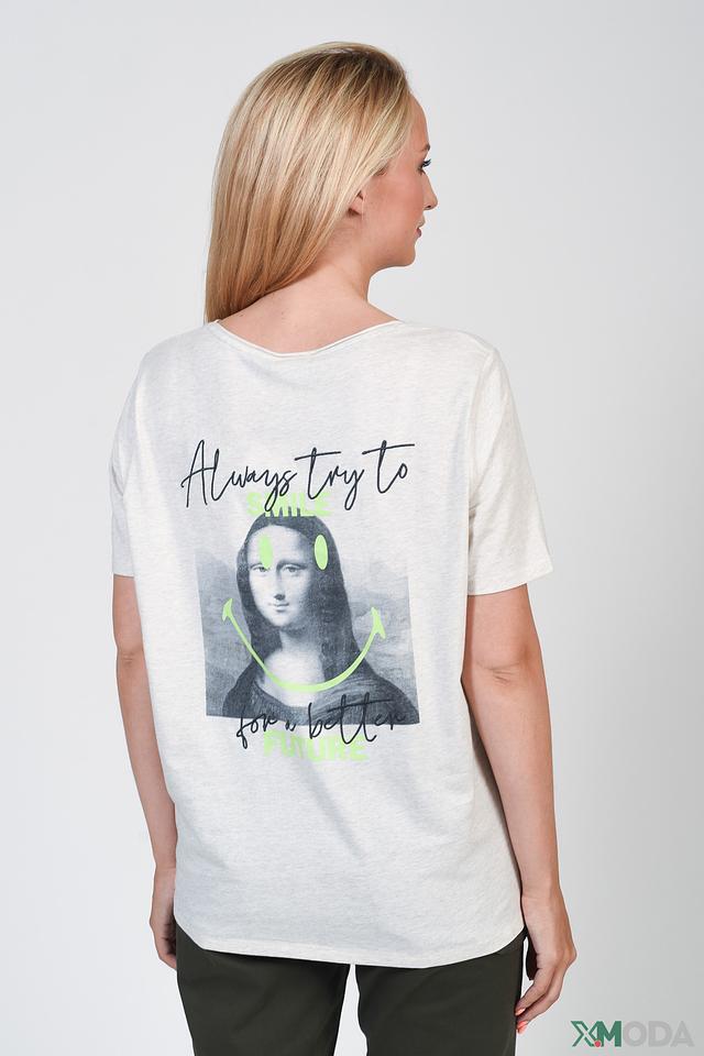 Особенностью данной футболки является яркий принт на спине с изображением Моны Лизы и надписью "Always try to smile for a better". На груди также присутствует небольшой логотип бренда в лаймовом цвете.