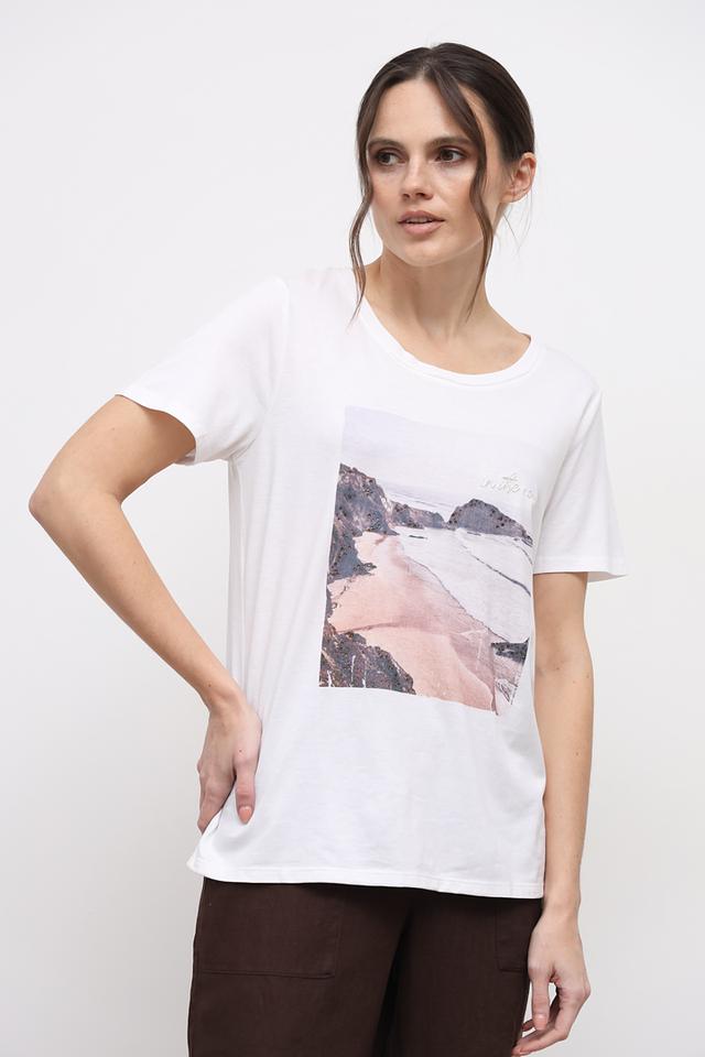 Особенностью данной модели является яркий принт с изображением пейзажа, который добавляет ей индивидуальности и стиля. Футболка имеет прямой крой, короткие рукава и классический круглый вырез горловины.