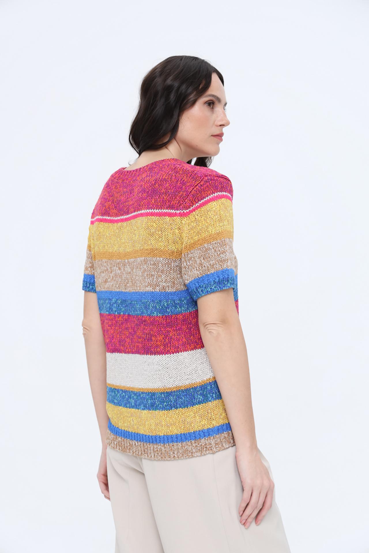 Вязаный полосатый пуловер от Oui — это яркое и стильное дополнение к вашему гардеробу. Сочетание различных цветов делает этот джемпер уникальным и привлекательным, а короткие рукава добавляют образу легкости и свежести. Пуловер идеально подходит для создания непринужденных, но модных образов.