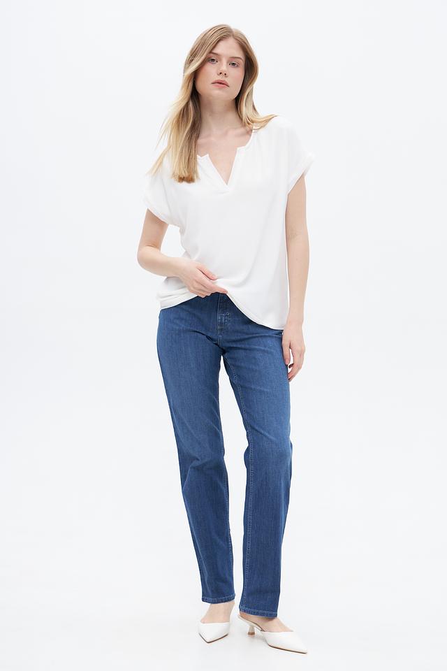 Джинсы имеют прямой крой и стандартную посадку, обеспечивающую комфорт в течение всего дня. Ткань состоит из 81% хлопка, 17% полиэстера и 2% эластана, что гарантирует удобство, износостойкость и небольшую эластичность.