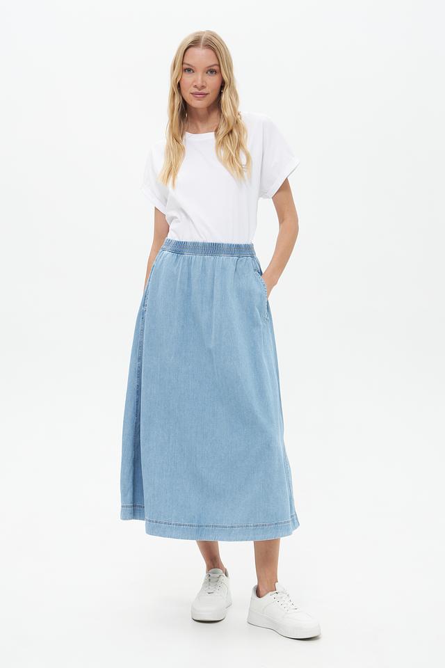 Юбка Paddocks светло-голубого цвета выполнена из денима с эластичным поясом и боковыми карманами. Эта модель станет отличным дополнением к вашему повседневному гардеробу, сочетая в себе комфорт и стиль. Состав: хлопок 67%, тенсель 33%