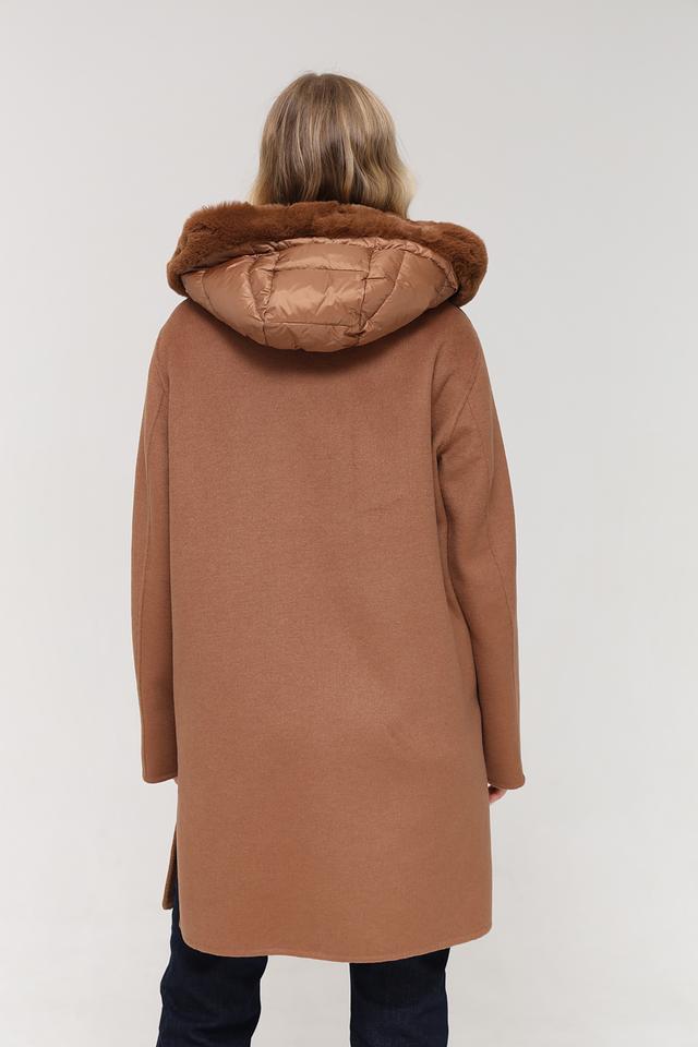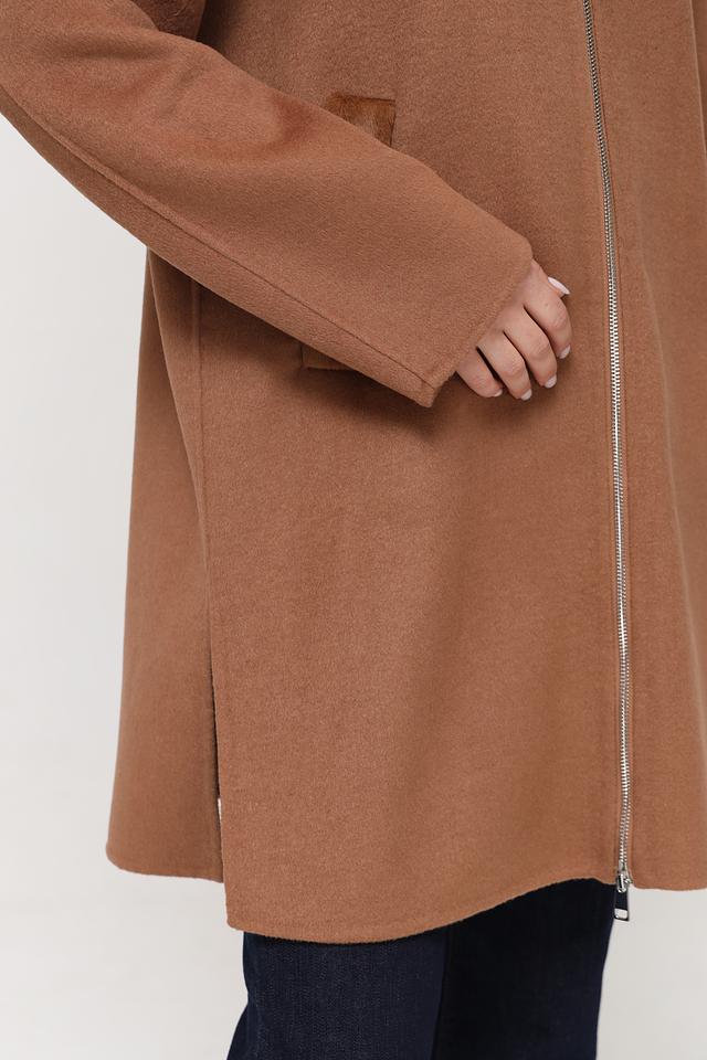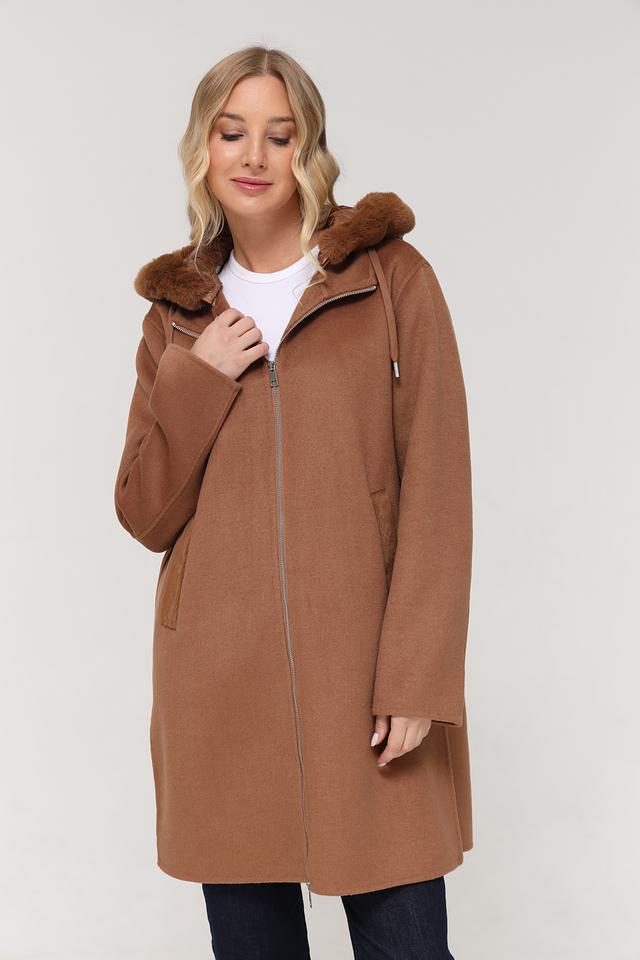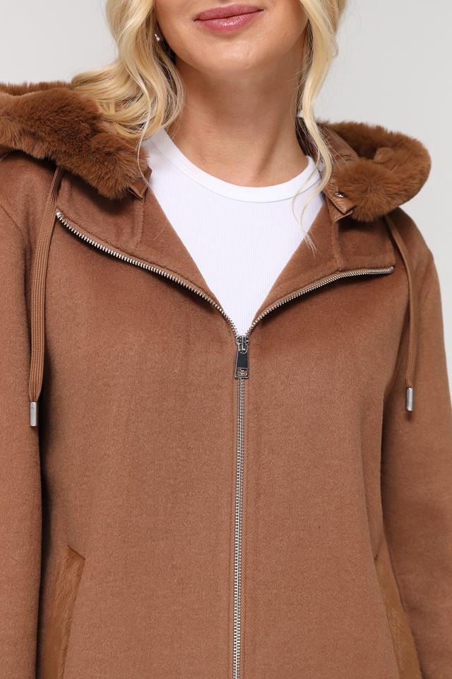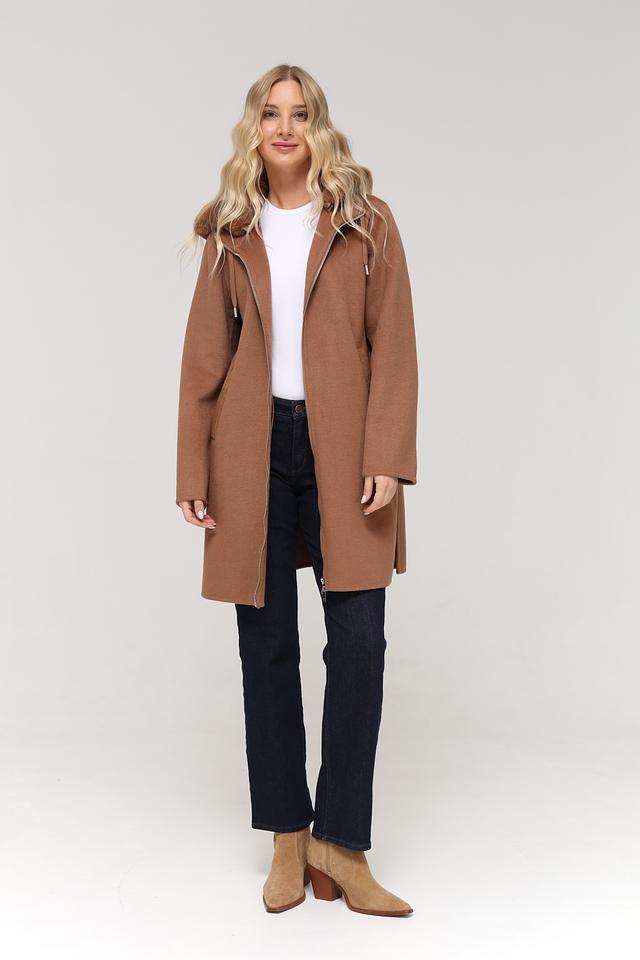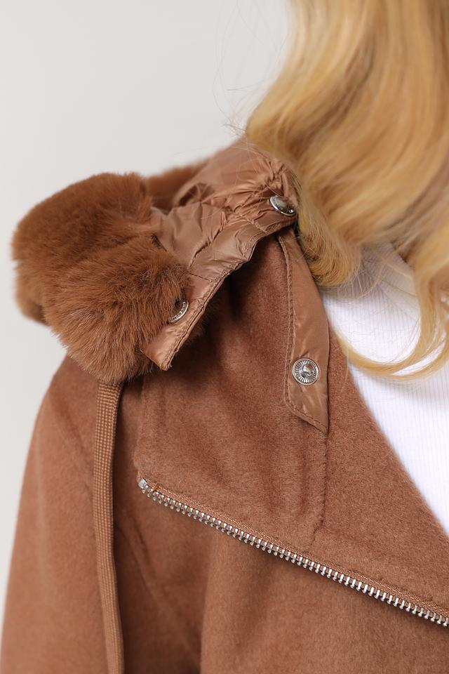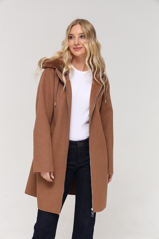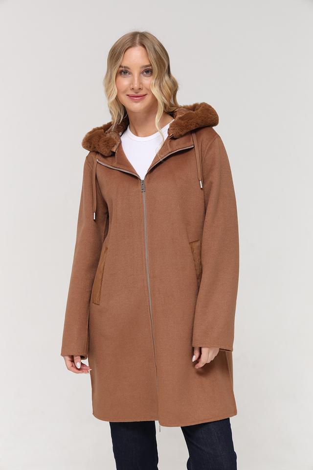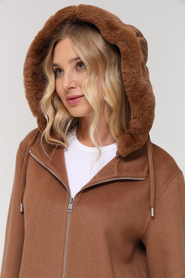 Пальто застегивается на молнию, а капюшон дополнен отделкой из искусственного меха, что придает изделию особый шарм. Наличие капюшона обеспечивает дополнительную защиту от ветра и осадков.