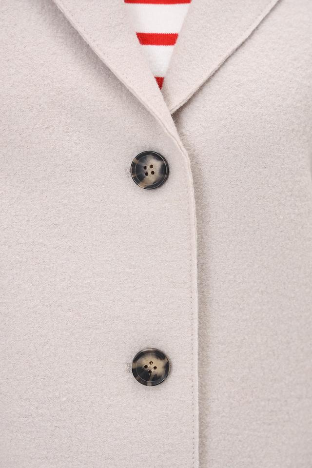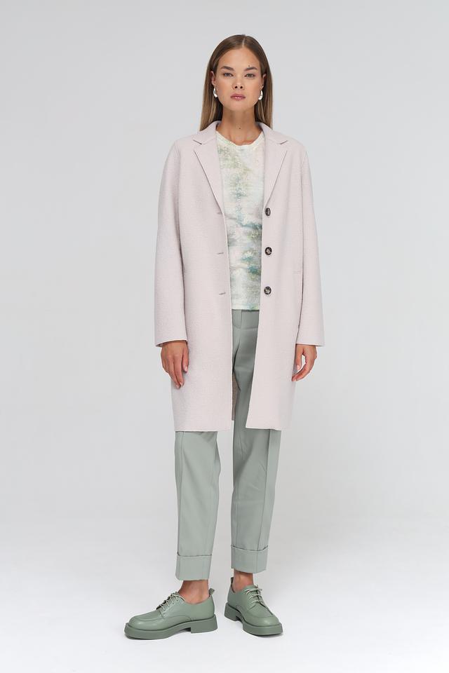 Модель застегивается на три пуговицы в тон изделия. Воротник пальто отложной, что придает ему элегантный вид. Пальто имеет прорезные карманы по бокам.