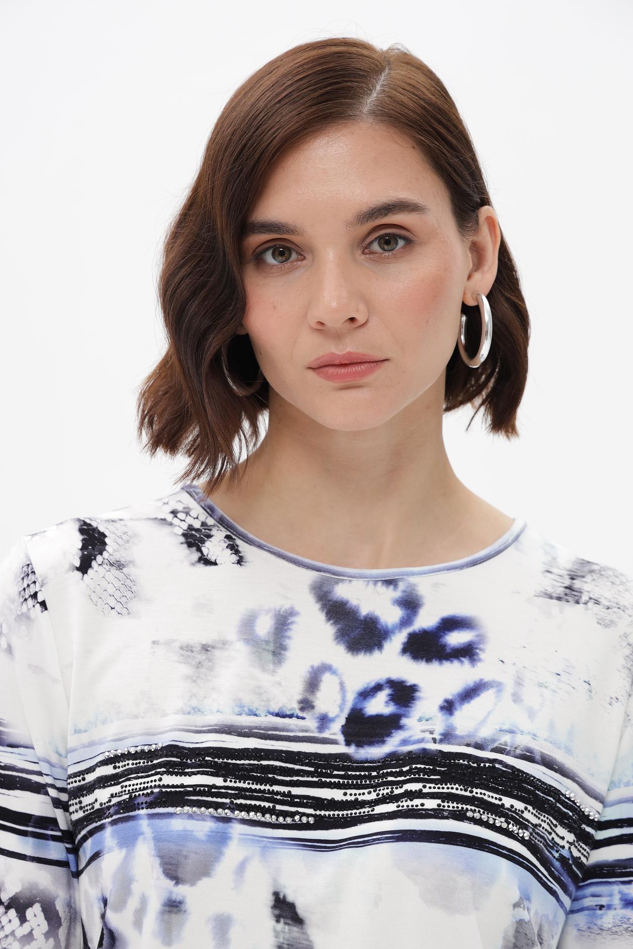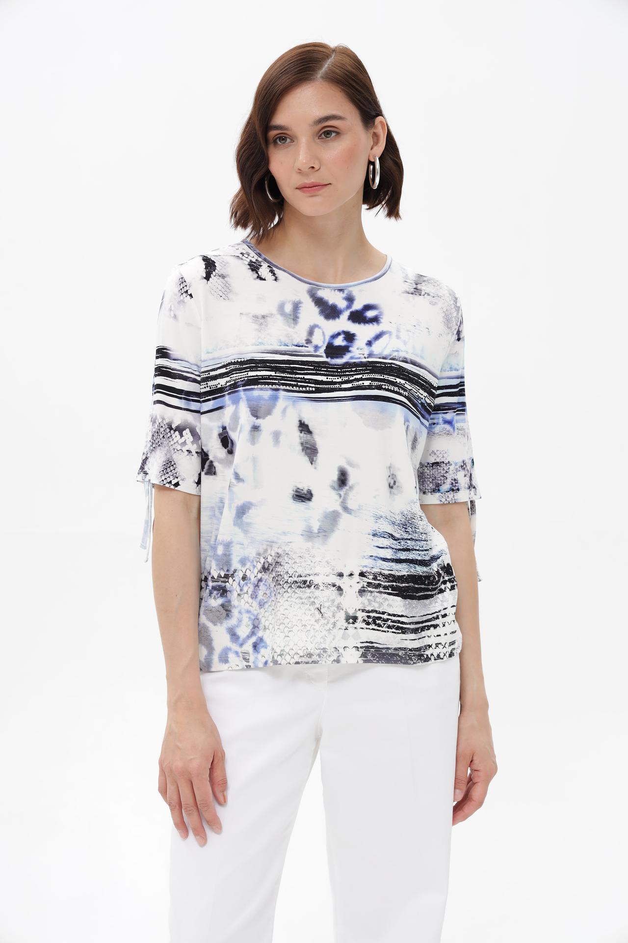 Футболка Passioni выполнена из высококачественной вискозы (95%) с добавлением эластана (5%), что обеспечивает идеальную посадку и комфорт в течение всего дня. Модель отличается уникальным абстрактным принтом в синих, серых и черных тонах на белом фоне, добавляя динамичности повседневному образу. Это стильная женская футболка, которая станет ярким акцентом в вашем гардеробе.