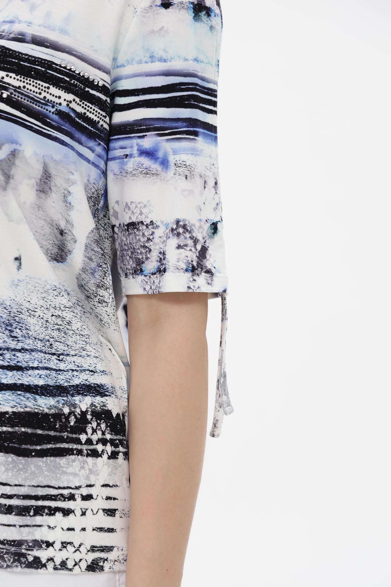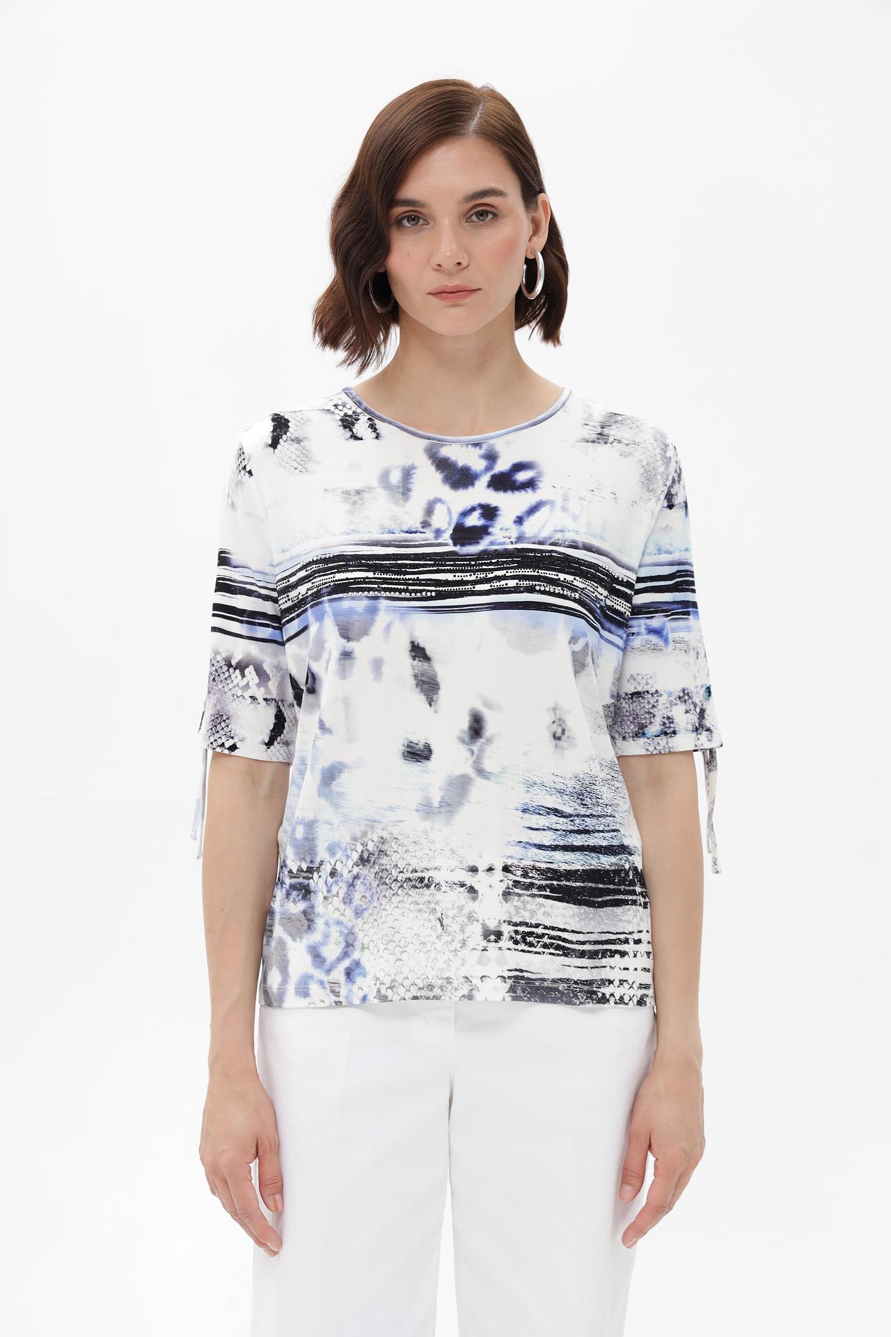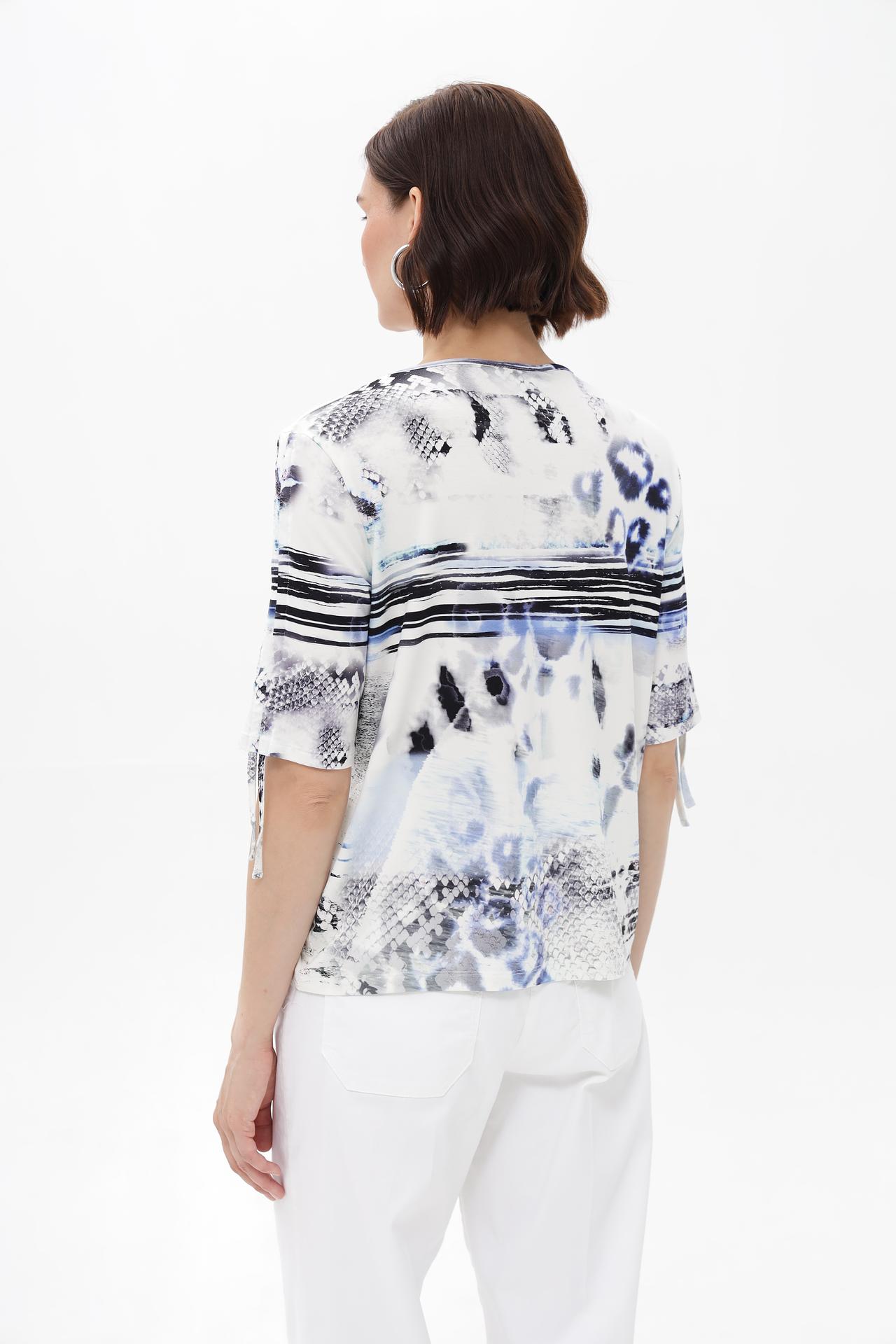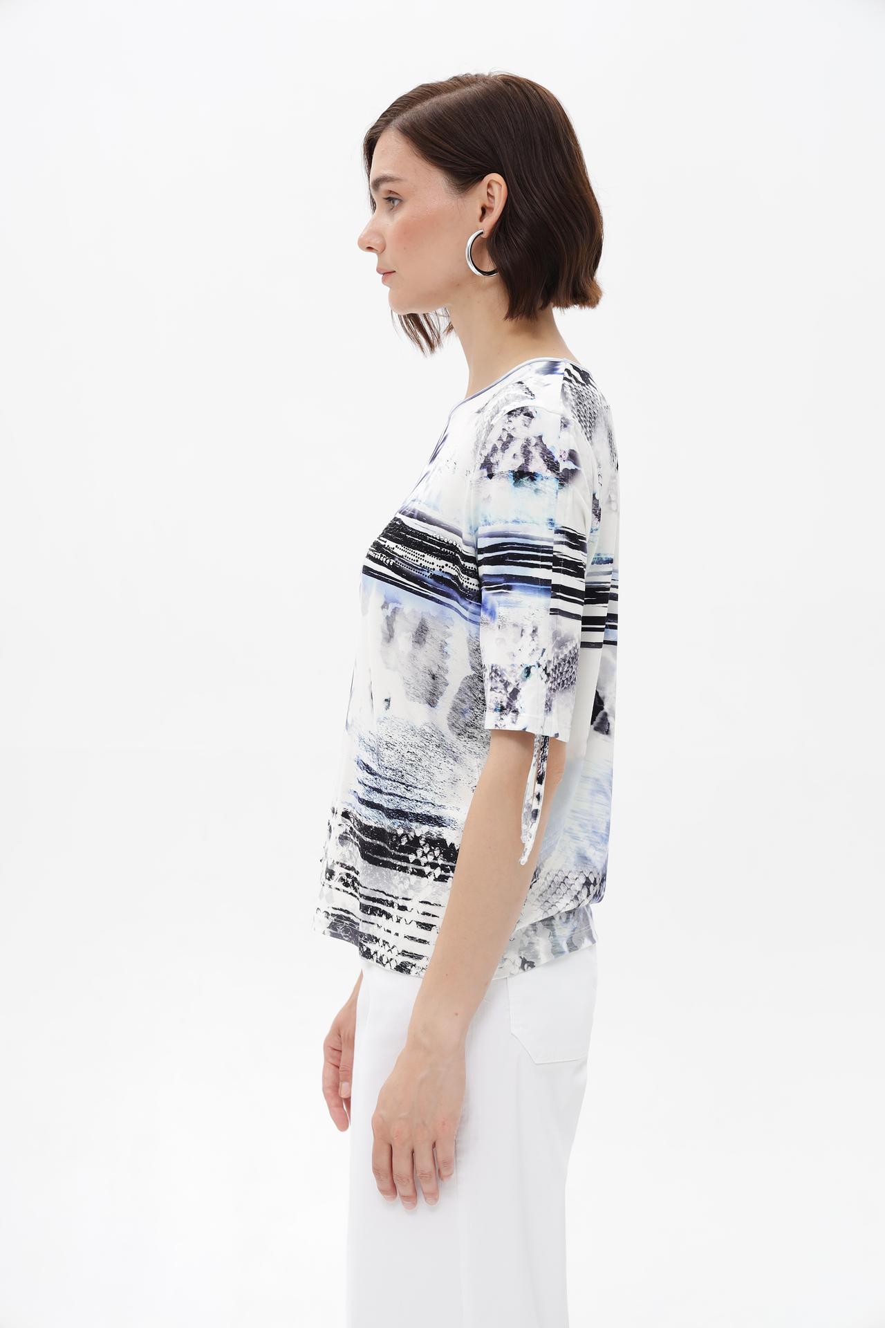 - Стильный дизайн: Актуальный абстрактный принт делает эту модную блузку по-настоящему современной. Дополнительные завязки на коротких рукавах придают изделию оригинальность и позволяют регулировать их длину, добавляя изысканности.