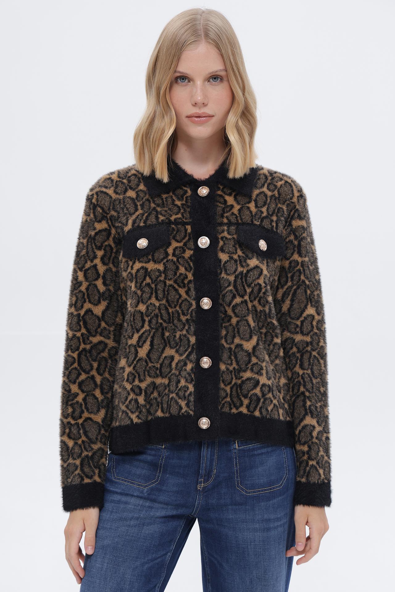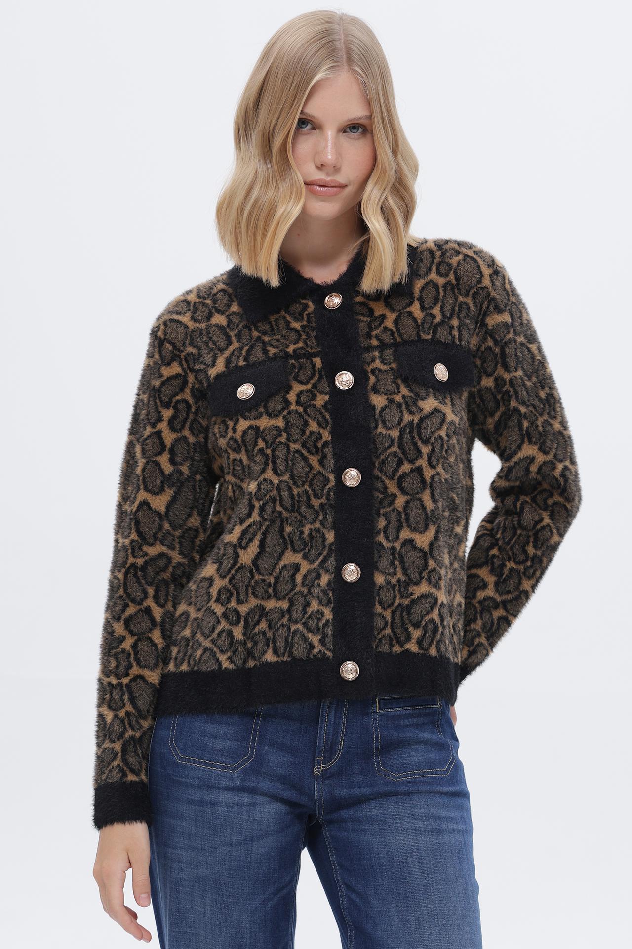 - Дизайн: Яркий леопардовый принт в сочетании с классическим черным кантом и элегантными золотистыми пуговицами создает притягательный и модный образ. Накладные карманы спереди добавляют функциональности и завершают дизайн.