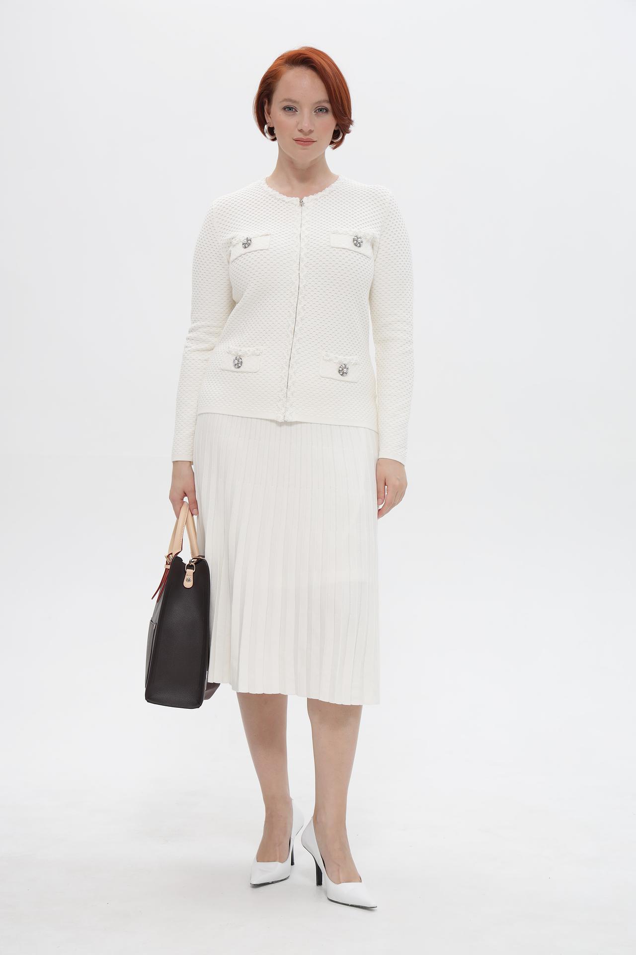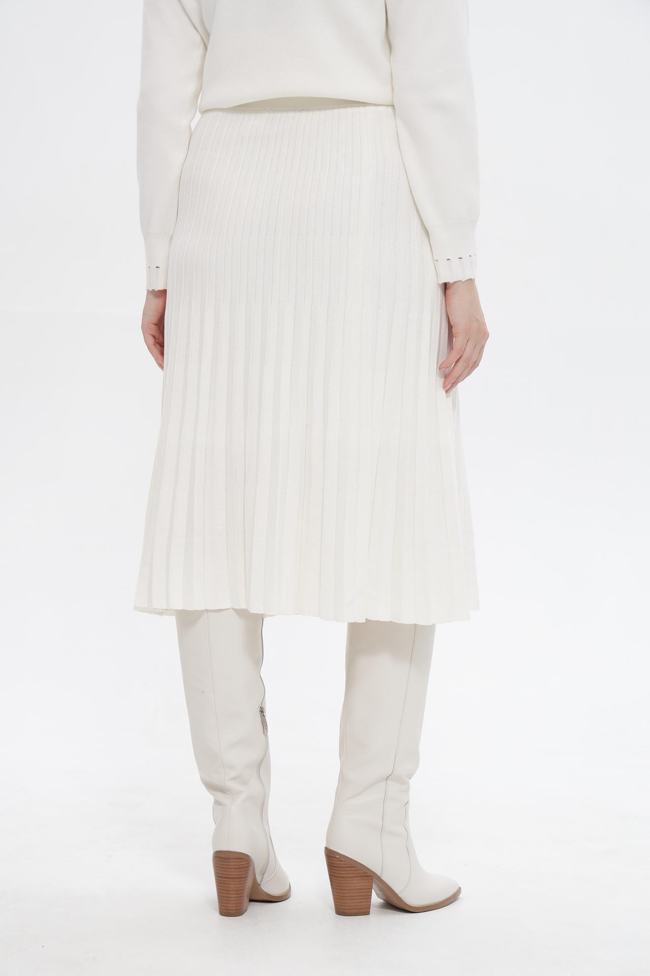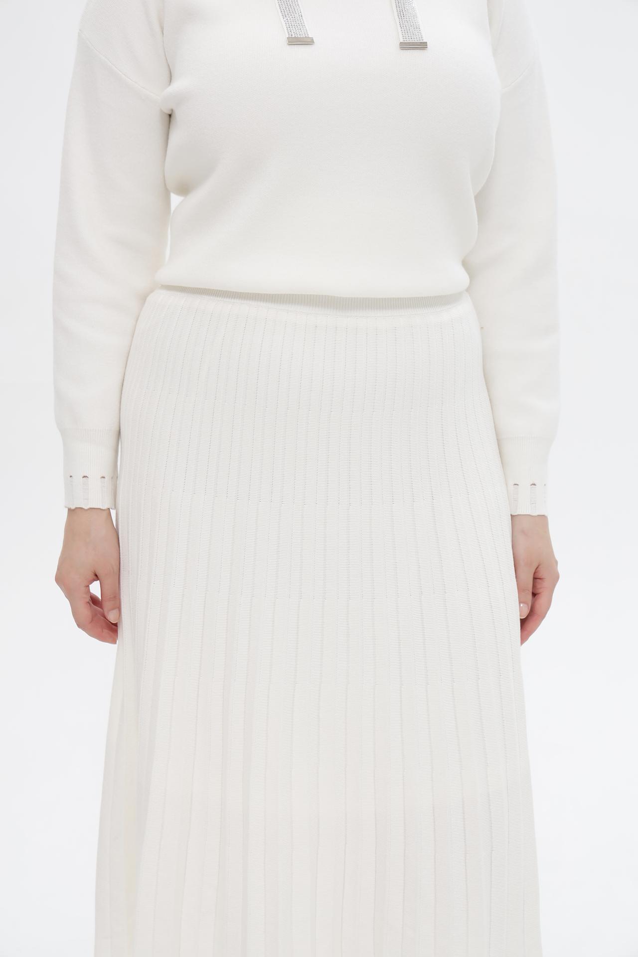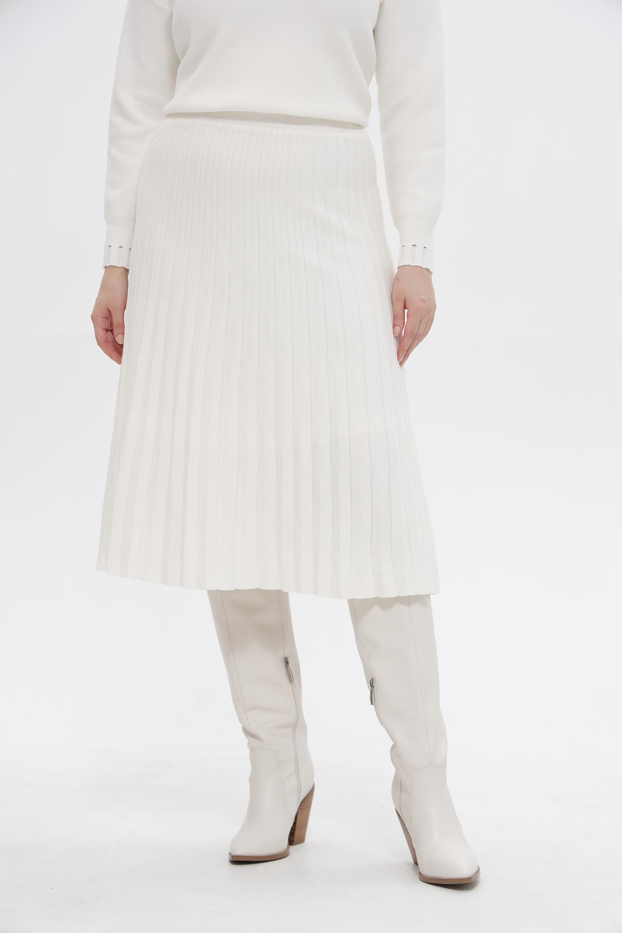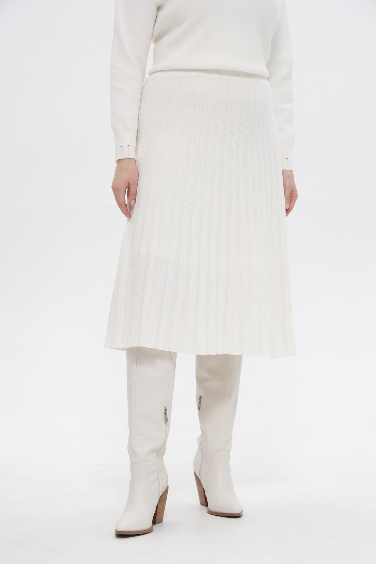 Юбка изготовлена из качественной смесовой ткани, состоящей из 20% полиамида и 80% вискозы. Этот состав обеспечивает приятные тактильные ощущения, отличную драпируемость и износостойкость. Материал хорошо держит форму, не мнется и сохраняет первоначальный вид после многочисленных стирок. Белый цвет юбки позволяет сочетать ее с самыми разнообразными оттенками и создавать как строгие деловые, так и расслабленные повседневные комплекты.