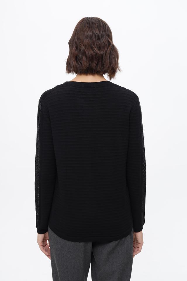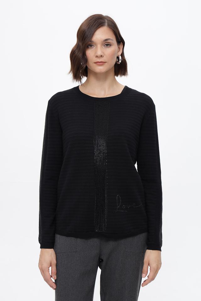 Основной цвет изделия – чёрный, что делает его универсальным дополнением к любому гардеробу. Пуловер украшен вертикальной полосой из сверкающих страз и небольшой надписью “Love”, добавляя изысканности и индивидуальности.