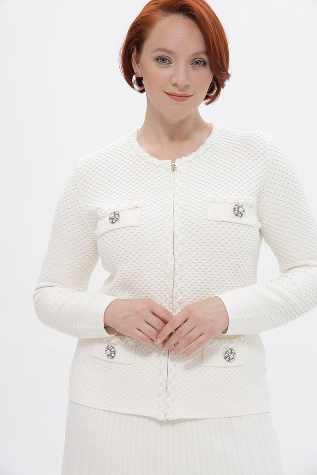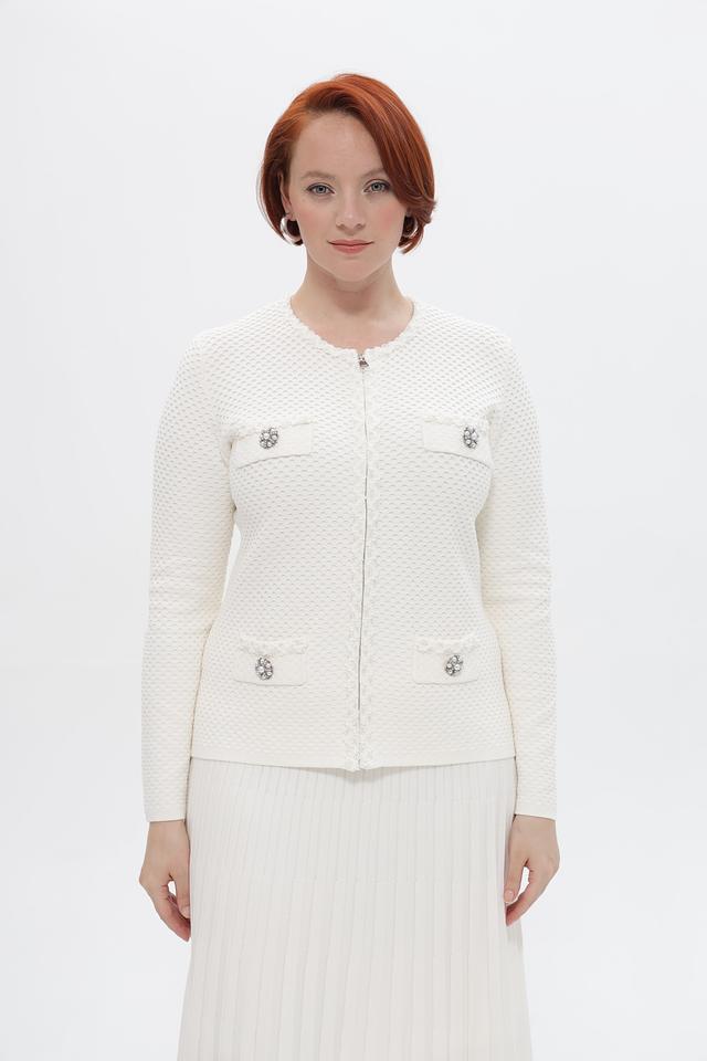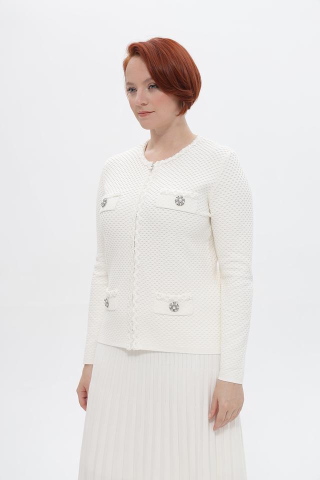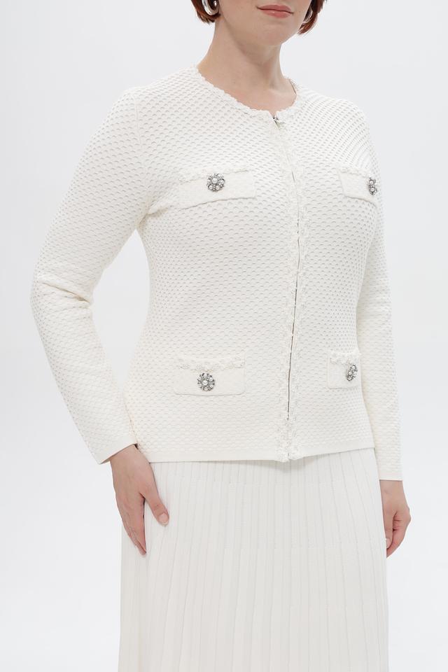 Белый жакет Passioni из фактурного трикотажа с декоративными элементами. Модель на молнии с карманами, украшенными стразами. Идеальное дополнение к вашему образу. Состав: вискоза 80%, полиамид 20%