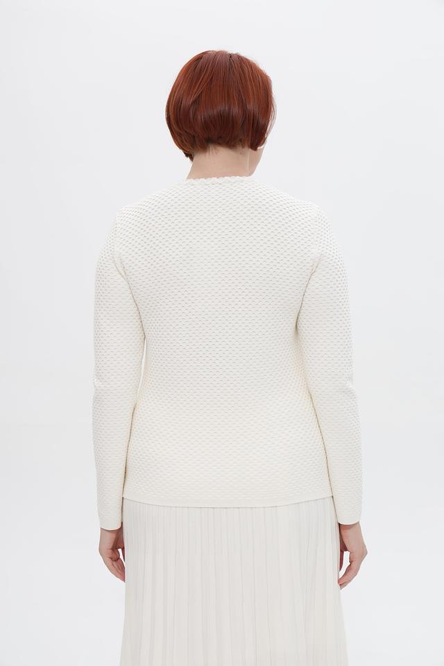 Белый жакет Passioni выполнен из фактурного трикотажа с выразитой плеткой. Модель имеет приталенный силуэт и длину до бедер. Застежка — молния по всей длине. Жакет дополнен двумя накладными карманами с клапанами, декорированными стразами.
