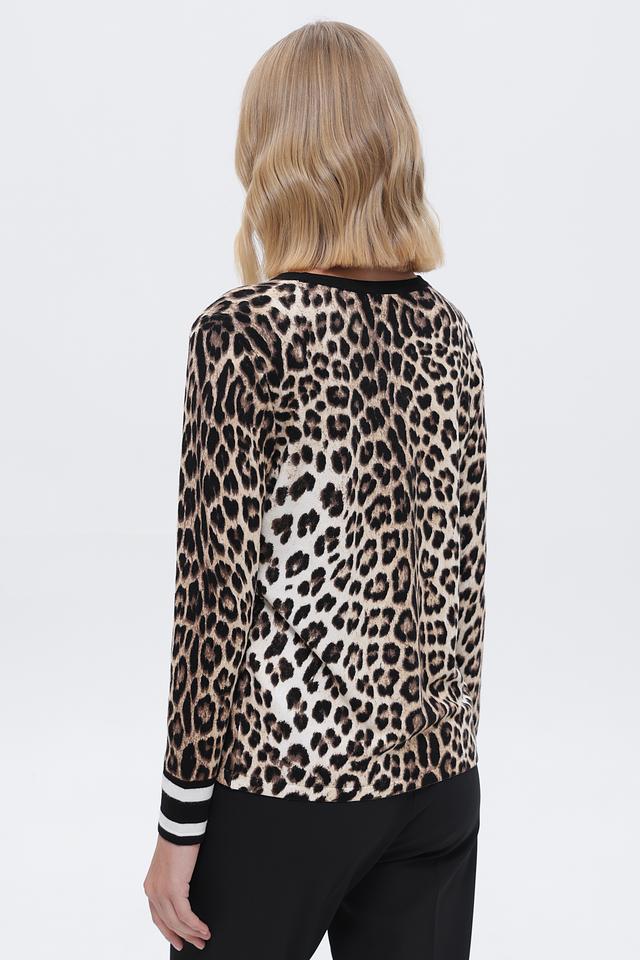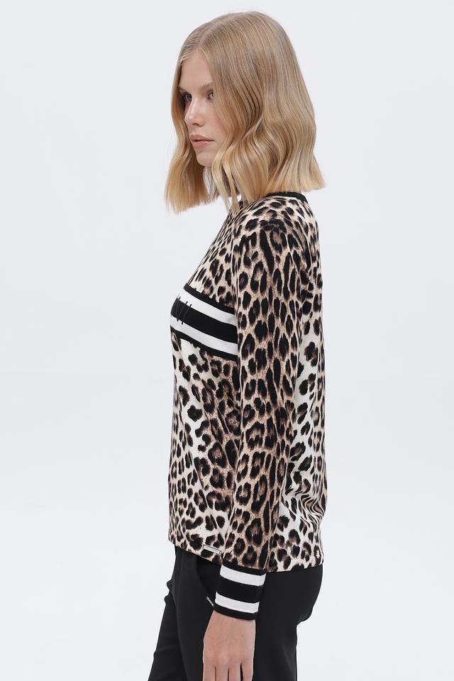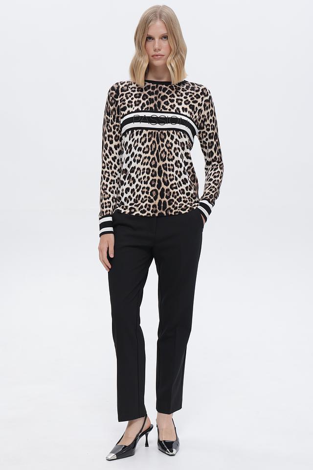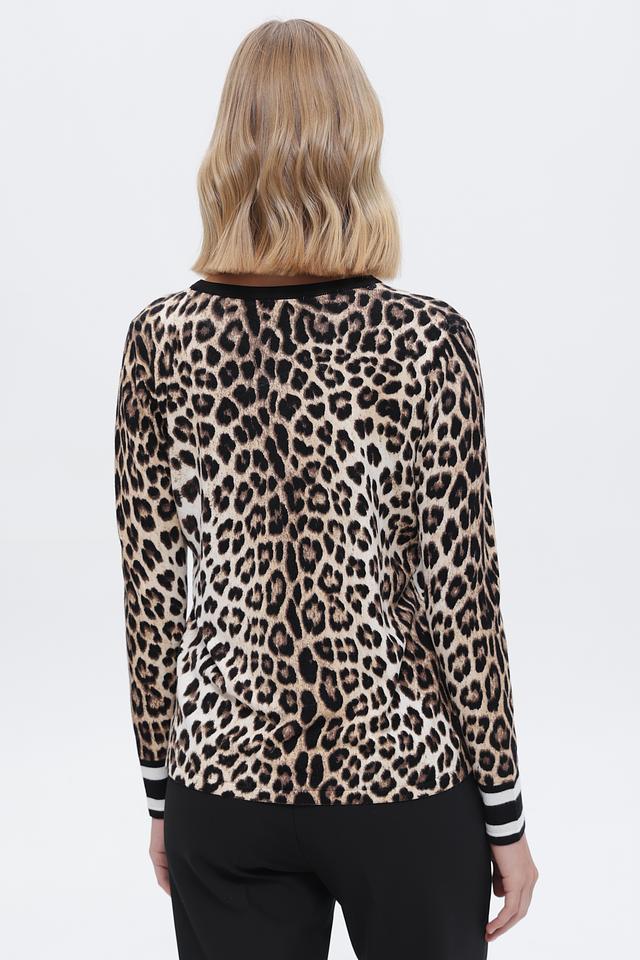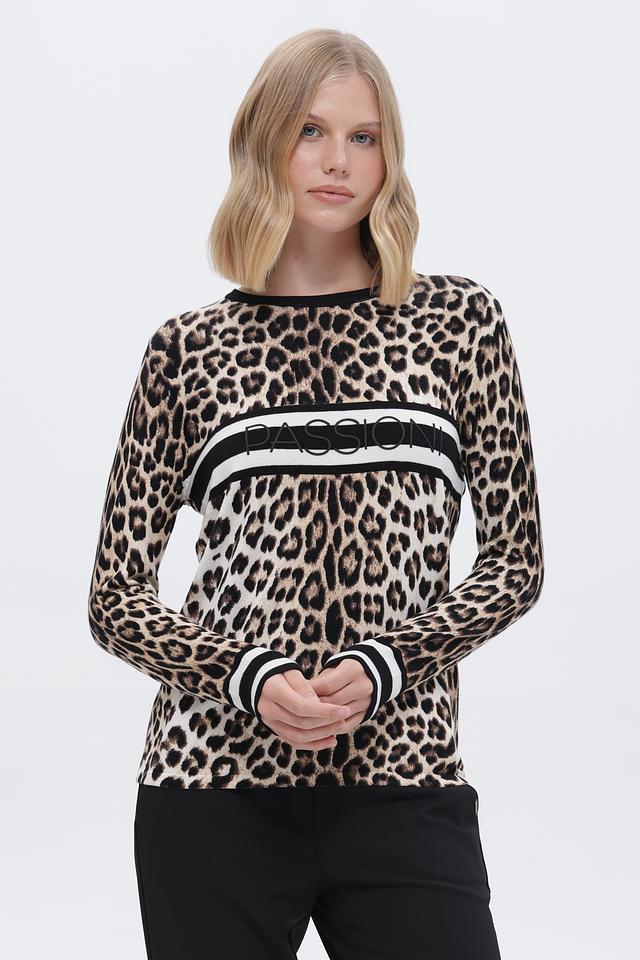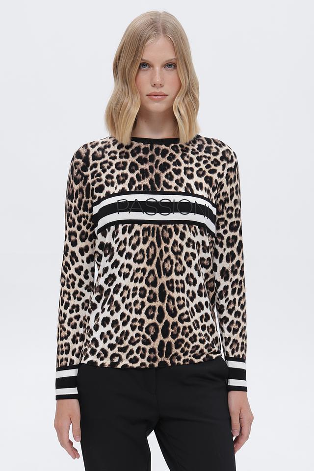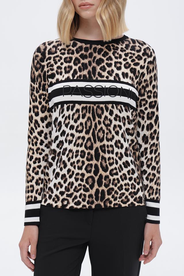Женский пуловер Passioni бежевого цвета с ярким леопардовым принтом и отделкой полосами. Изготовлен из мягкой вискозы с добавлением полиамида для комфорта и износостойкости. Состав: вискоза 80%, полиамид 20%