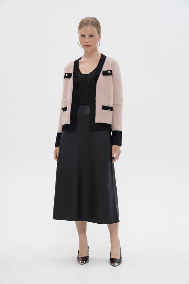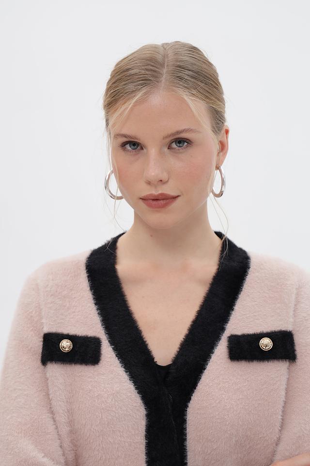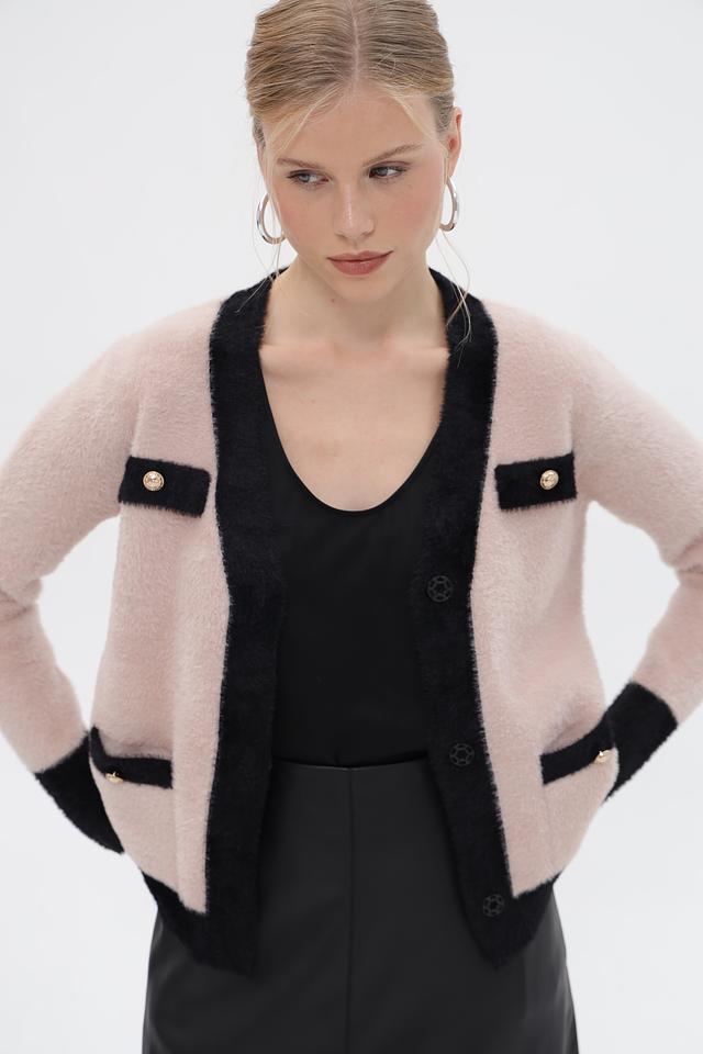Женский жакет Passioni выполнен в нежном розовом цвете с контрастной чёрной отделкой по краю, горловине и планкам. Модель имеет V-образный вырез и застегивается на декоративные пуговицы золотистого цвета.