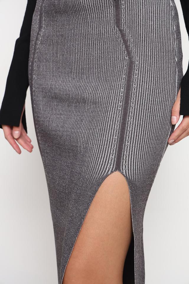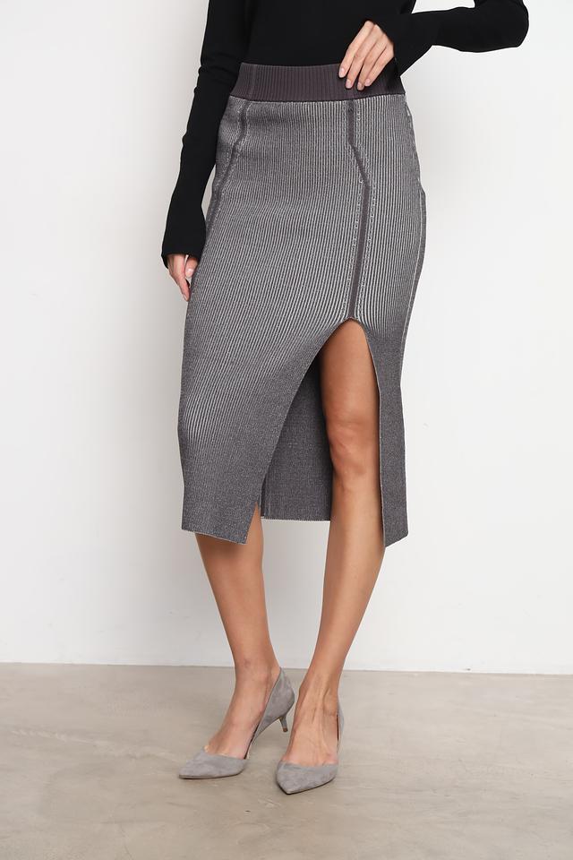 Модель имеет приталенный крой и длину миди, а также стильный разрез сзади, добавляющий образу динамичности. Эластичный пояс обеспечивает комфортную посадку по фигуре.