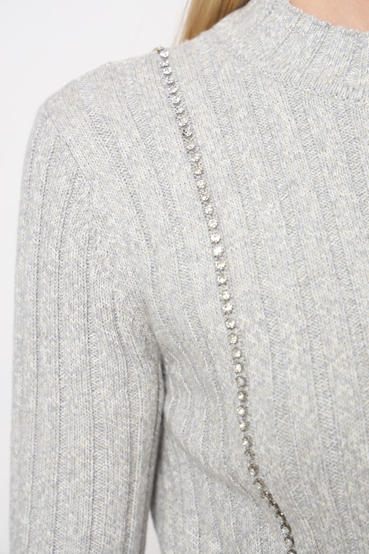 Оригинальный дизайн джемпера дополнен декоративными элементами в виде сверкающих страз, расположенных вдоль вертикальных швов. Такой акцент придает модели изысканность и неповторимый шарм. Круглый вырез горловины и длинные рукава обеспечивают удобство и универсальность.