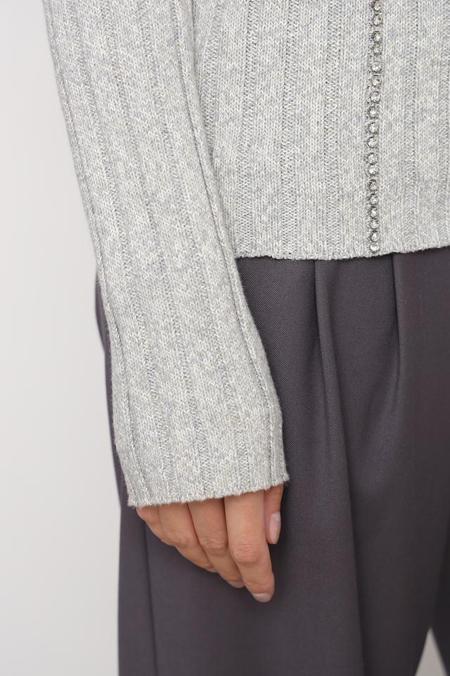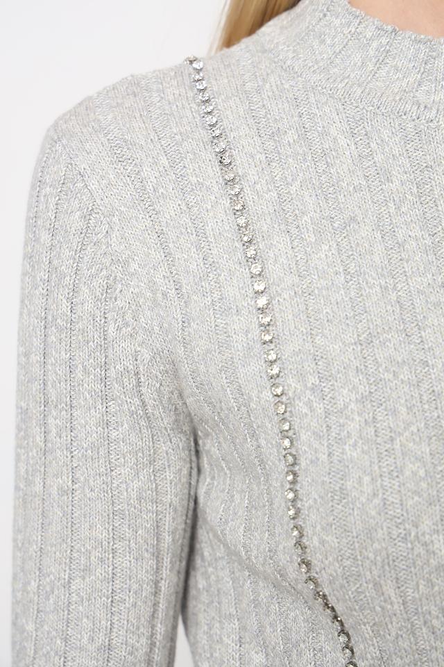 Джемпер имеет классический силуэт с длинными рукавами и округлым вырезом горловины. Особый акцент сделан на декор в виде цепочек, которые расположены по бокам изделия, придавая ему изысканность и оригинальность.