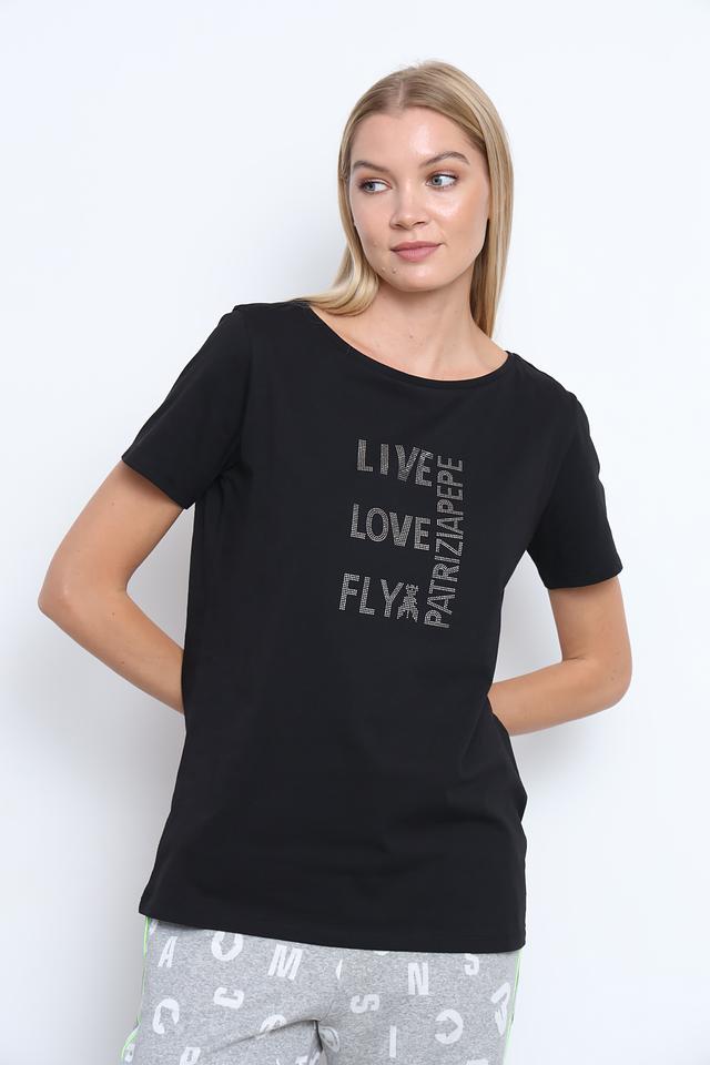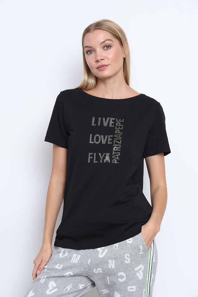 Чёрная футболка Patrizia Pepe с оригинальным принтом "LIVE LOVE FLY". Изготовлена из 100% хлопка, обеспечивая комфорт и воздухопроницаемость. Стильный и лаконичный дизайн делает эту футболку универсальным элементом гардероба. Состав: хлопок 100%