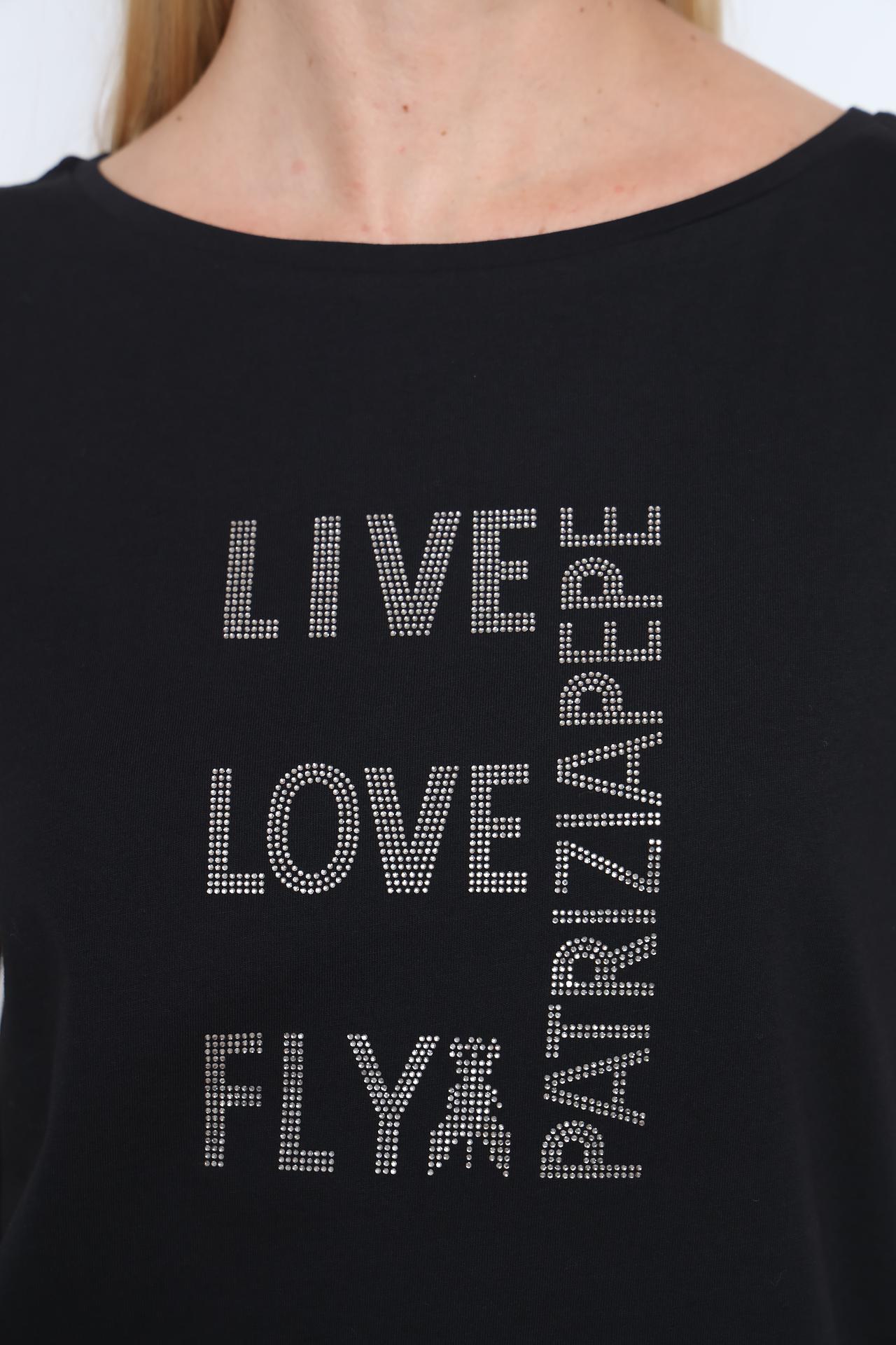 Футболка отличается лаконичным дизайном и удобным кроем, подчеркивающим достоинства фигуры. Декоративный принт из страз с надписями "LIVE", "LOVE", "FLY" и названием бренда "PATRIZIA PEPE" придает изделию особую изысканность и модный акцент. Круглый вырез и короткие рукава дополняют классический силуэт.
