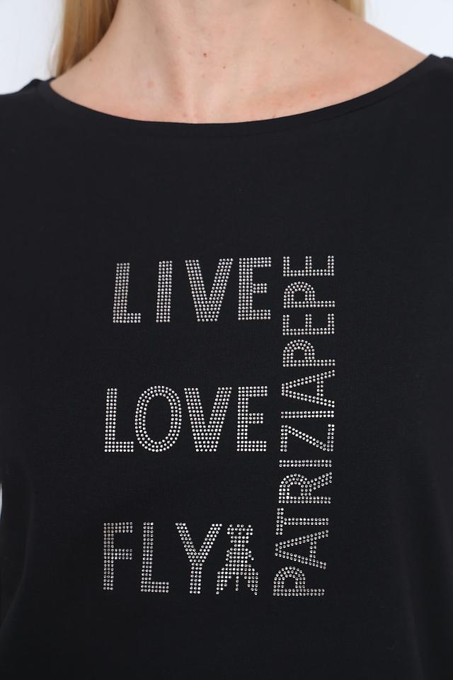 Основным акцентом футболки является оригинальный принт "LIVE LOVE FLY", выполненный в серебристом цвете. Он добавляет образу изюминку и выражает позитивный настрой.