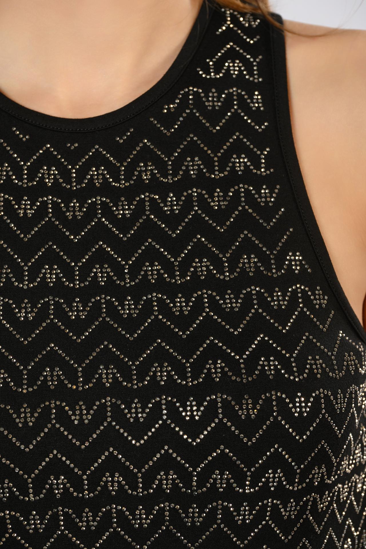 - Дизайн: Фасон без рукавов с круглым вырезом горловины. Передняя часть украшена оригинальным геометрическим узором, выложенным мелкими сверкающими стразами. Детали декора делают топ по-настоящему уникальным.