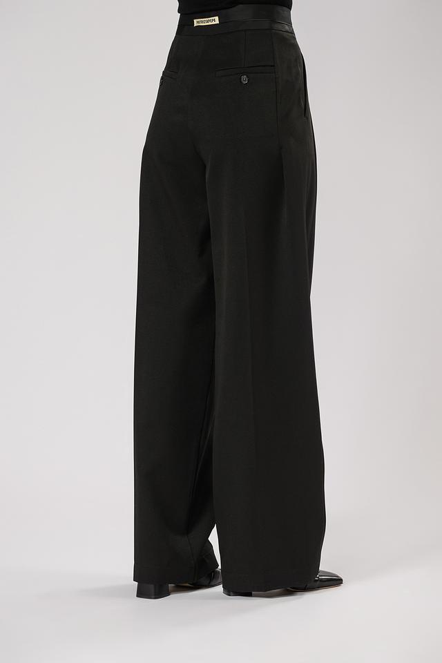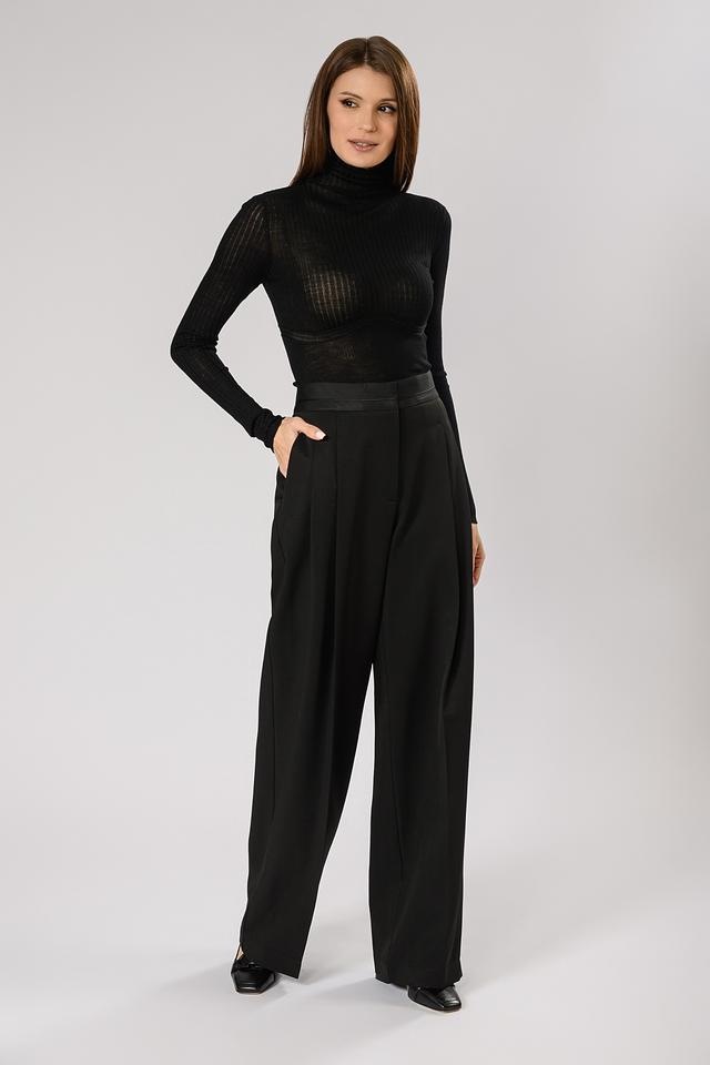 Брюки имеют прямой, широкий крой, который обеспечивает свободу движений и комфорт в течение всего дня. Высокая посадка визуально удлиняет ноги и подчеркивает талию. Передняя часть брюк украшена аккуратными складками, добавляющими образу изысканности.