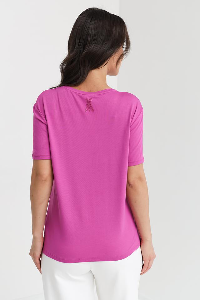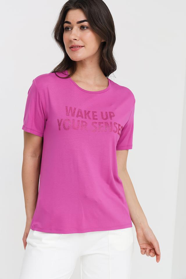 Женская футболка Patrizia Pepe фуксиевого цвета с ярким принтом "WAKE UP YOUR SENSES" станет стильным дополнением к вашему гардеробу. Изготовлена из мягкой вискозы с добавлением эластана для комфорта и отличной посадки. Состав: вискоза 95%, эластан 5%