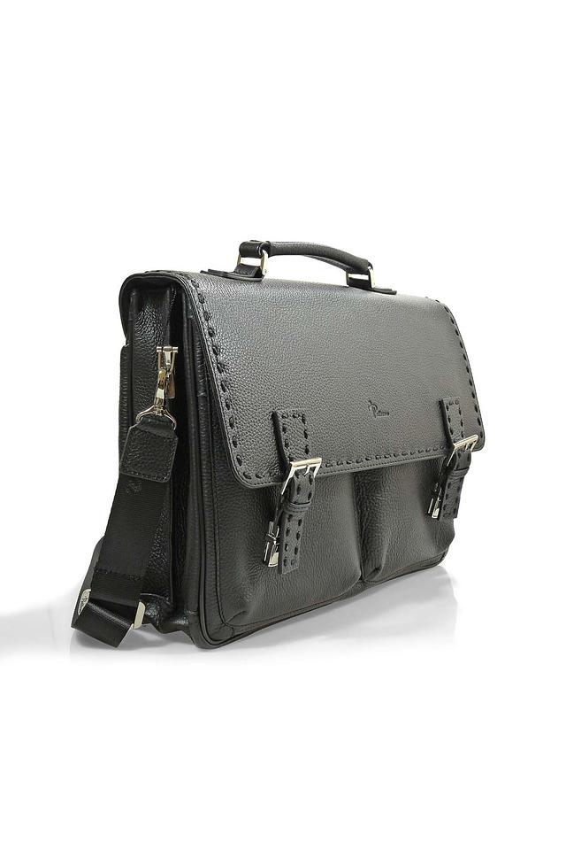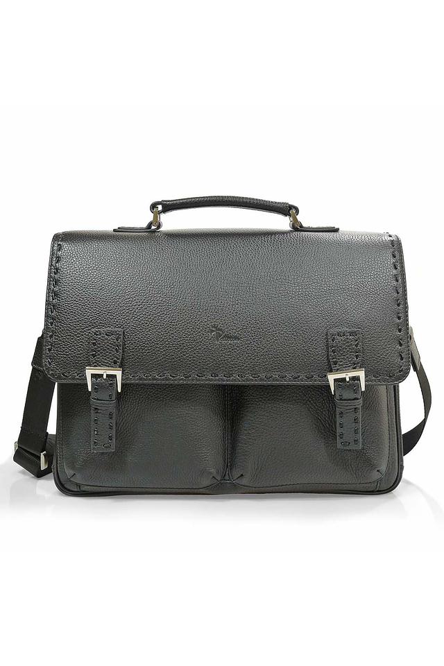 Портфель имеет удобную ручку для переноски в руке и регулируемый плечевой ремень для комфортного ношения на плече. Внутри предусмотрено несколько отделений для документов, планшета и других необходимых вещей. На передней части портфеля расположены два накладных кармана с декоративными ремнями и пряжками.