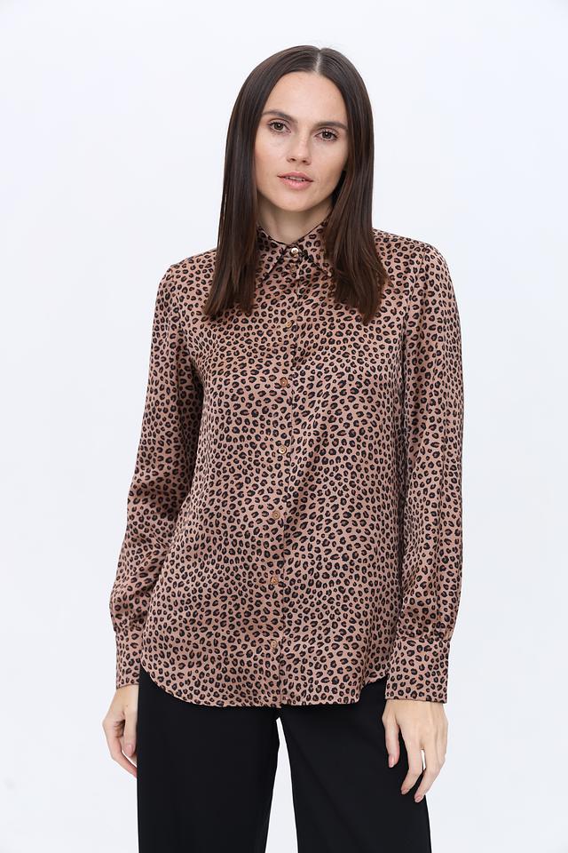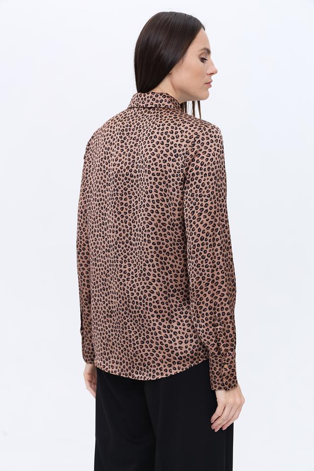 Рубашка имеет классический крой с длинными рукавами и отложным воротником. Застежка на пуговицах обеспечивает удобство ношения. Привлекательный леопардовый принт делает эту модель особенной и позволяет создавать запоминающиеся луки.