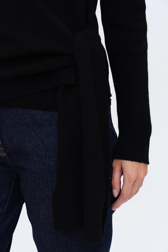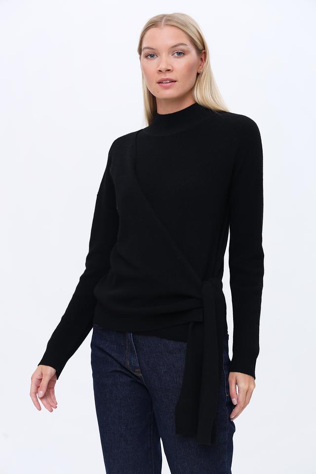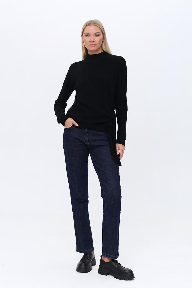Джемпер имеет прямой крой и длинные рукава. Особый акцент сделан на запахе и поясе, которые визуально подчеркивают талию и придают силуэту женственность. Высокий воротник добавляет изысканности.