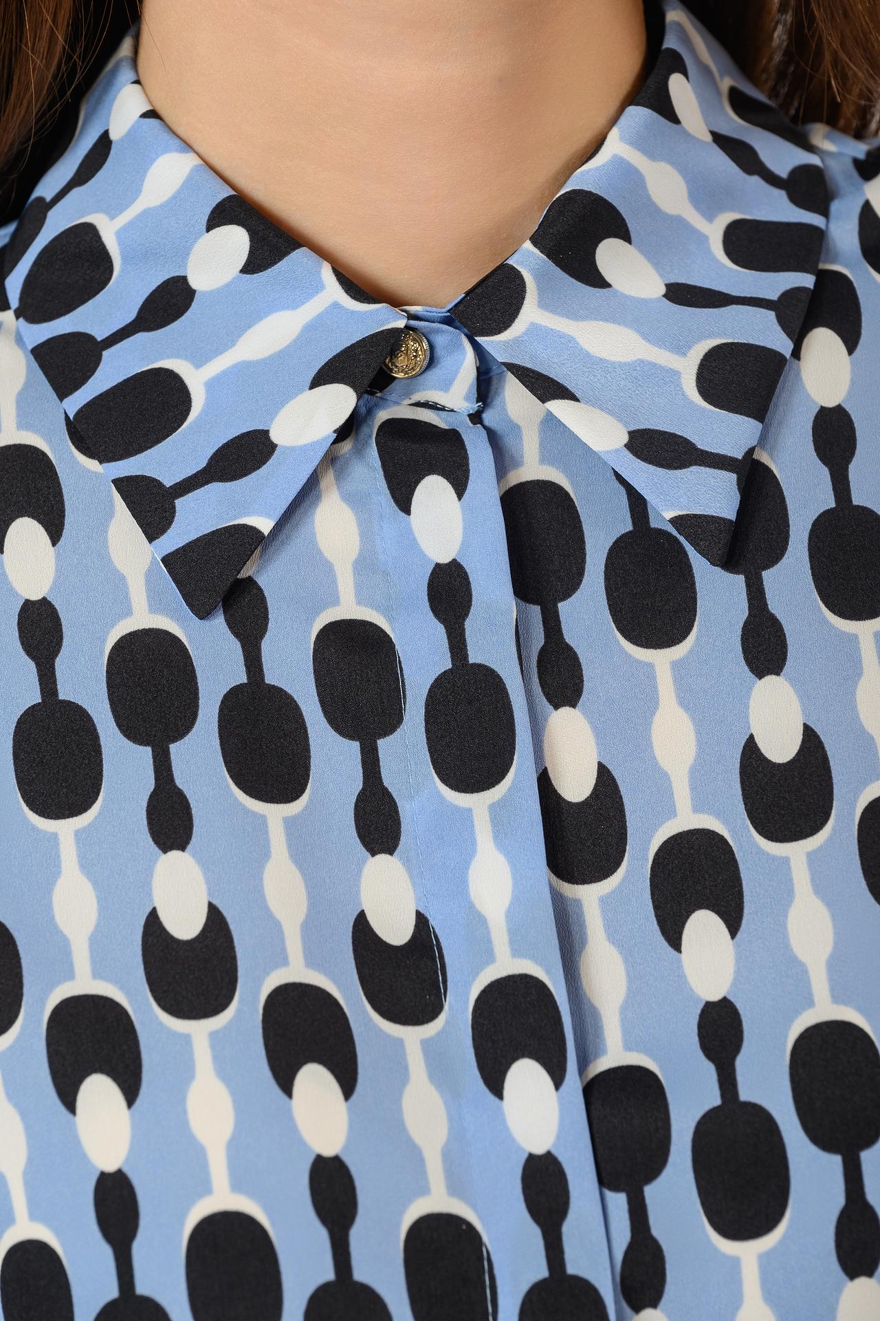 - Стильный геометрический принт: Оригинальный узор в виде стилизованных звеньев придает блузе современный и динамичный вид. Сочетание голубого, черного и белого цветов позволяет легко комбинировать блузу с однотонными брюками, юбками или джинсами.