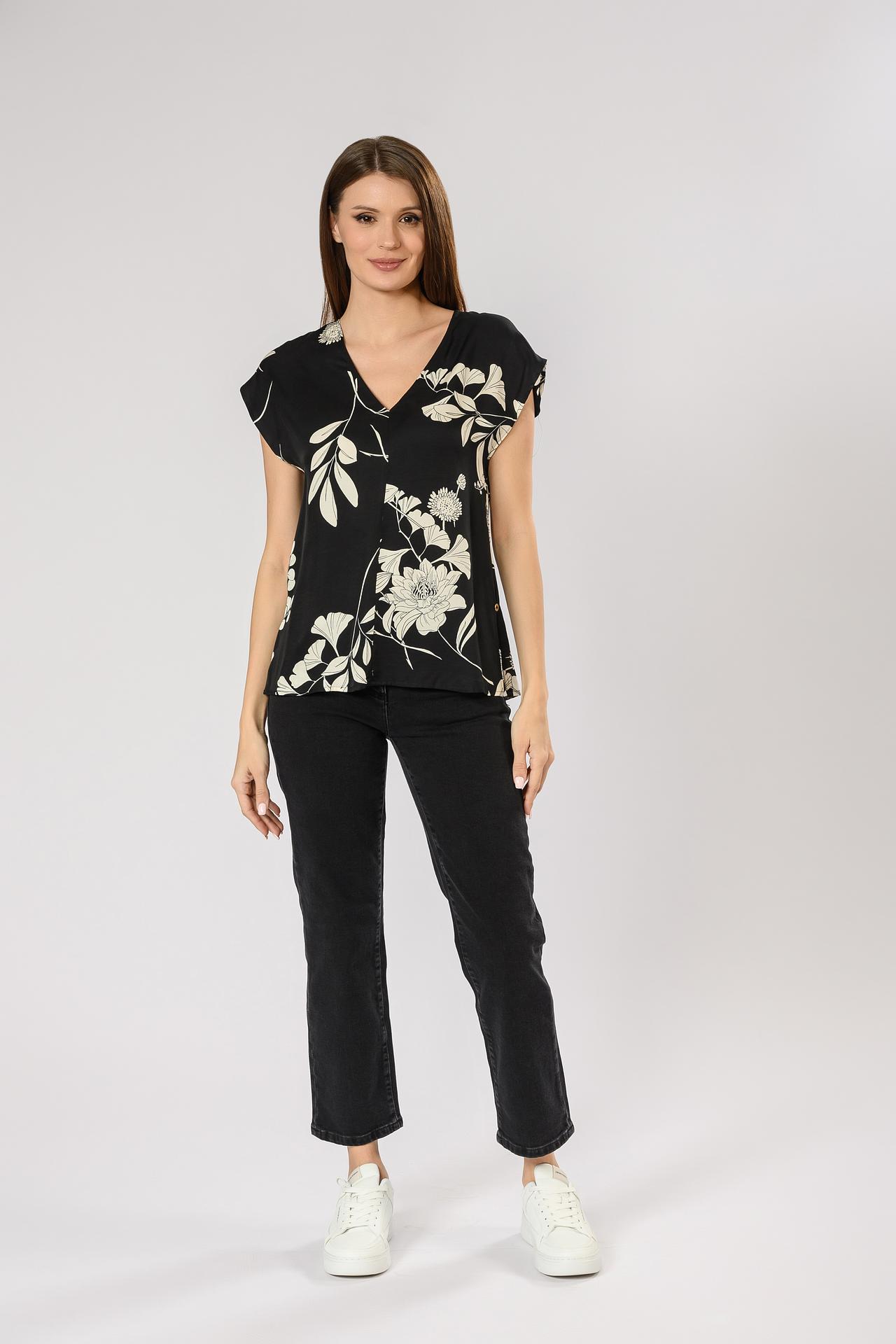 Модель свободного кроя с V-образным вырезом декорирована изысканным цветочным принтом на черном фоне. Рукава короткие, свободные, что добавляет образу непринужденности. Блуза легко сочетается с различными элементами гардероба, от джинсов до юбок, позволяя создавать разнообразные комплекты.