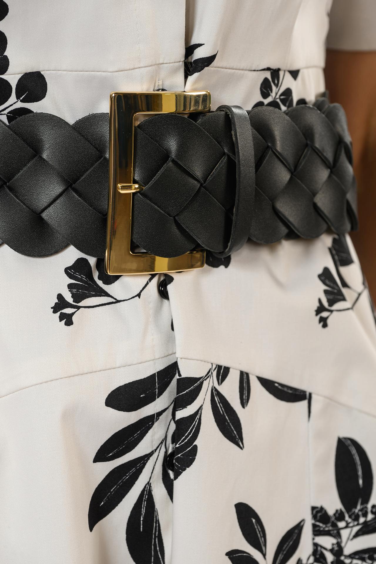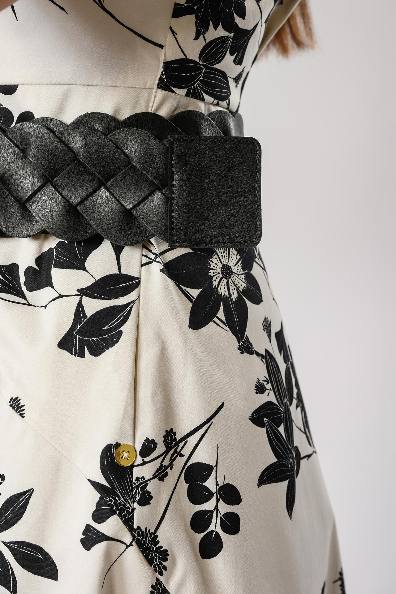 - Дизайн: Плетеное полотно и массивная золотистая пряжка. Необычная текстура ремня и элегантная пряжка акцентируют внимание на детали, придавая образу особую изюминку.