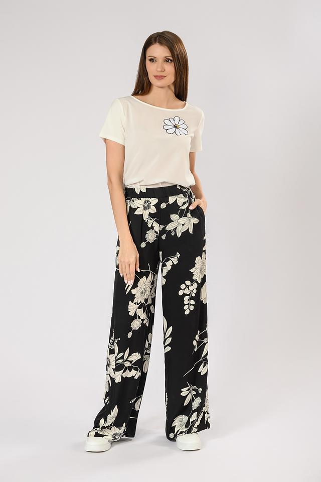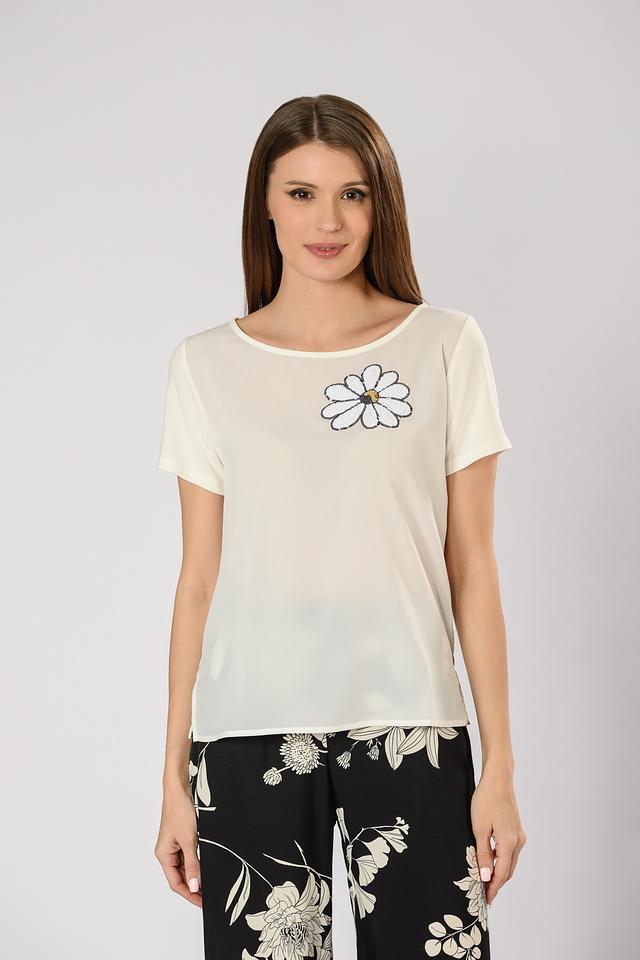 Футболка имеет прямой крой, короткий рукав и округлый вырез горловины. Главной особенностью модели является вышивка в виде цветка на груди, которая придает ей женственность и оригинальность.