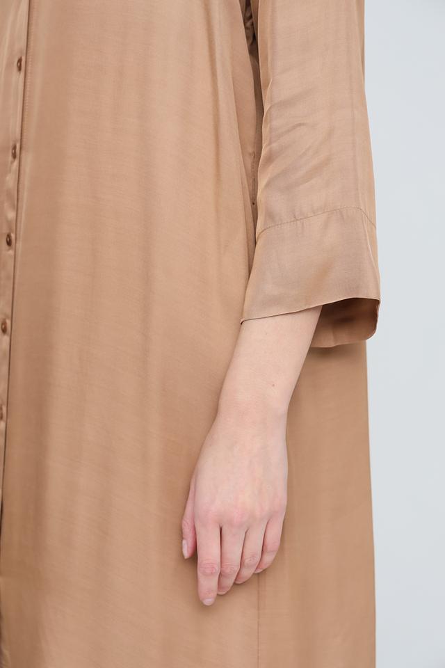Это платье от Penny Black выполнено в бежевом цвете и имеет свободный крой, напоминающий рубашку. Модель отличается длиной миди и застежкой на пуговицы по всей длине, что позволяет регулировать степень открытости и создавать различные силуэты.